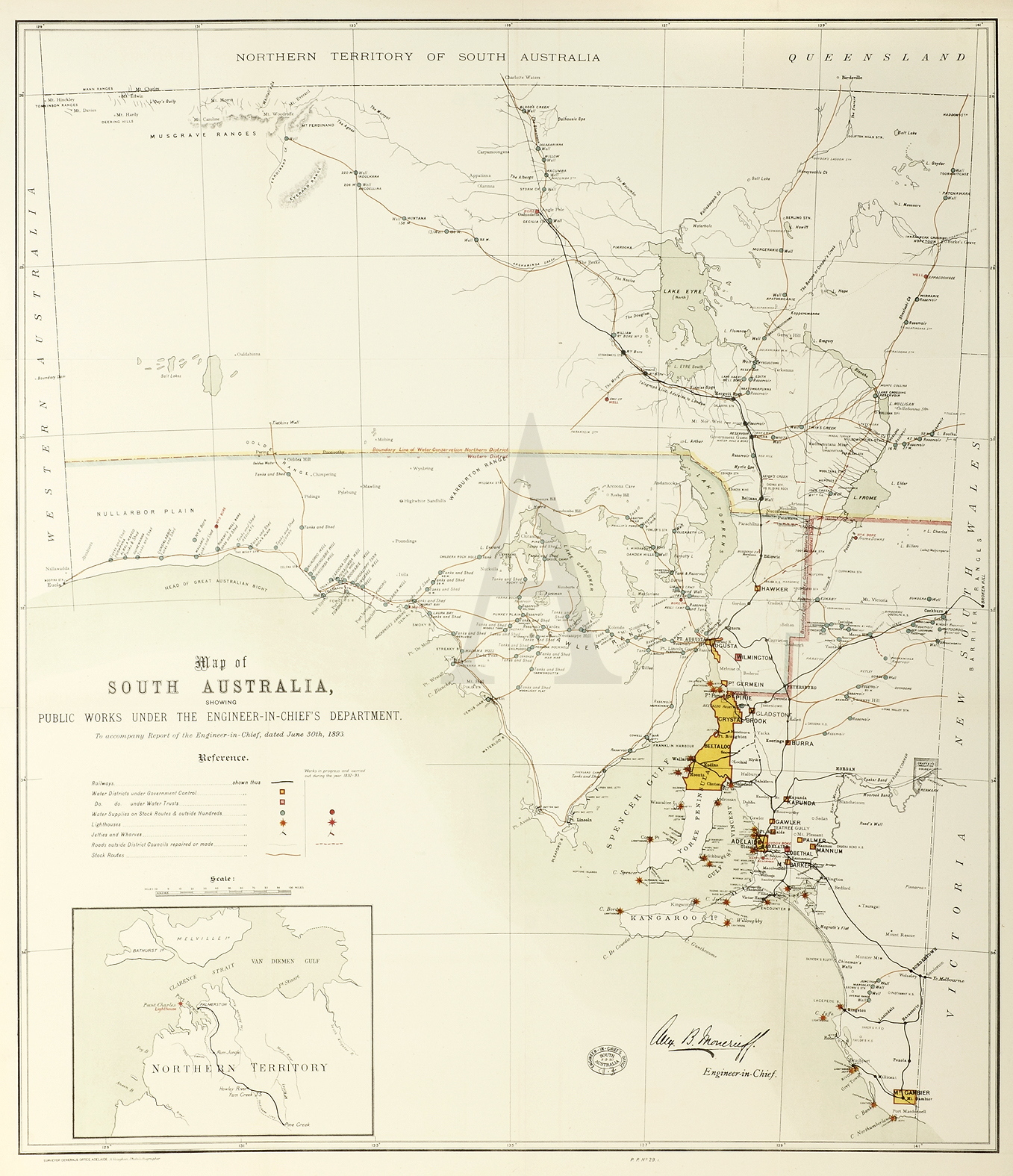 Rare large scale map of South Australia showing works carried out or under construction in South Australia and Northern Territory between 1892-1893. A colour key at lower left identifies: Railways, Water districts under Government control and those under Water Trusts, water supplies on stock routes, Lighthouses, Jetties, Wharves, roads and Stock routes. The inset at lower of the Northern Territory indicates the position of the Lighthouse for the Port of Darwin at Point Charles.