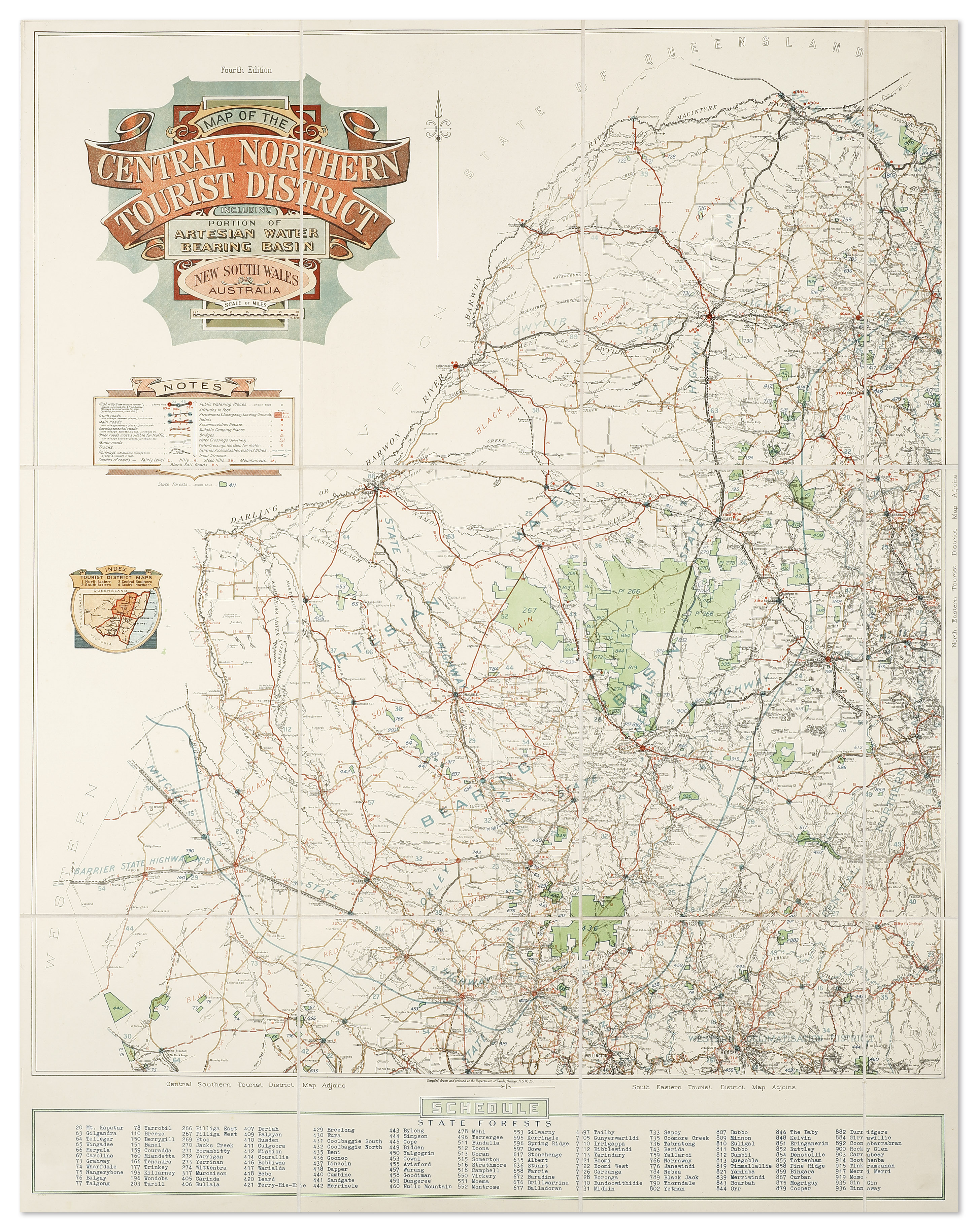 A decorative title states; ‘Including Portion of Artesian Water Bearing Basin New South Wales Australia’. Below the title there is another decorative panel ‘Notes’ with an extensive key noting the type of roads, accommodation, railways, aerodromes, camping grounds, water crossings too deep for motor car, Trout streams etc. This map clearly illustrates the increasing use of motor vehicles for holidaying around the state. The map includes locations of “Streams stocked with Trout & Bass”.