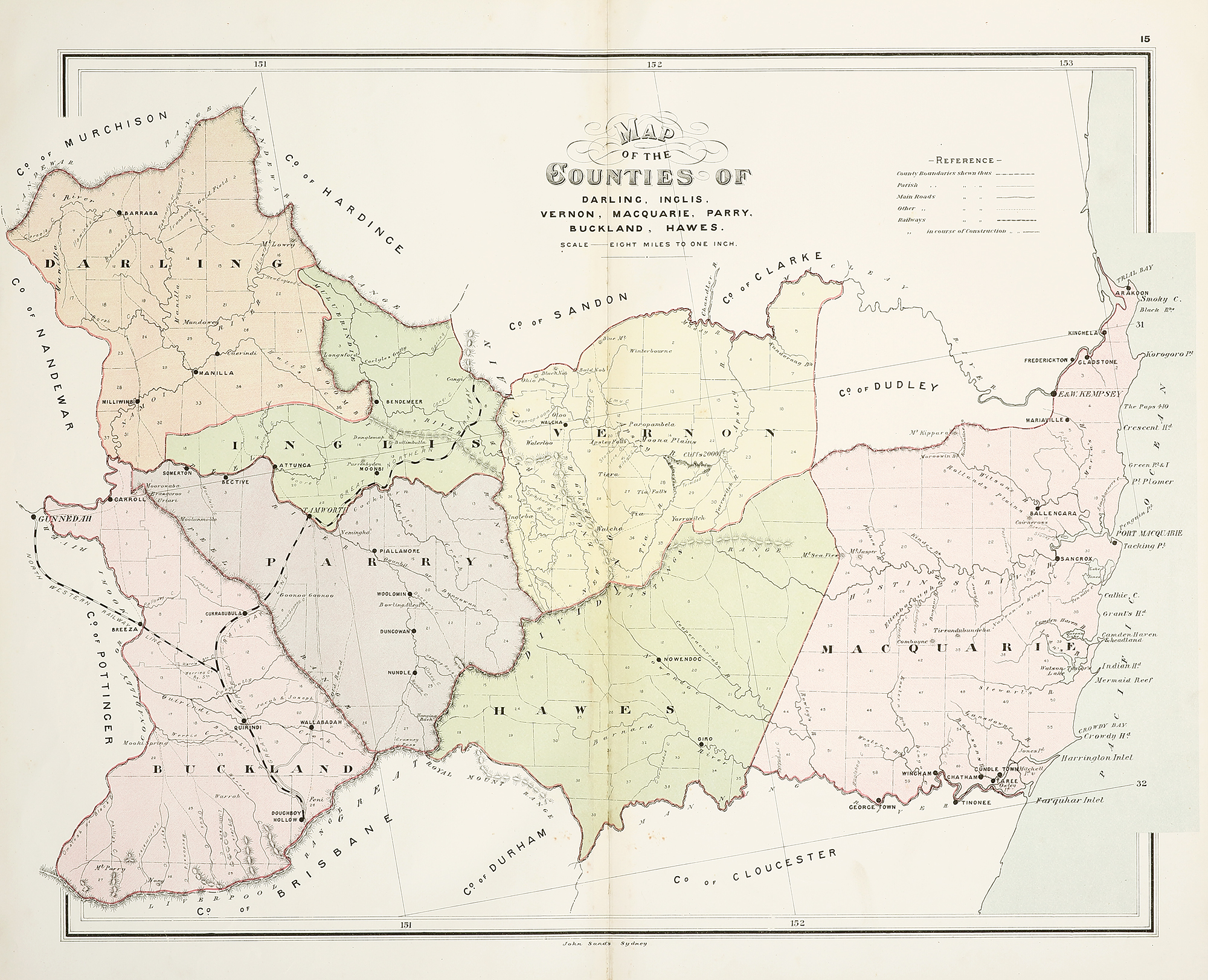 This map shows from Trial Bay in the north, Farquhar Inlet in the south and west to Gunnedah. Scarce county map of New South Wales from the first atlas devoted to the continent issued in Australia.