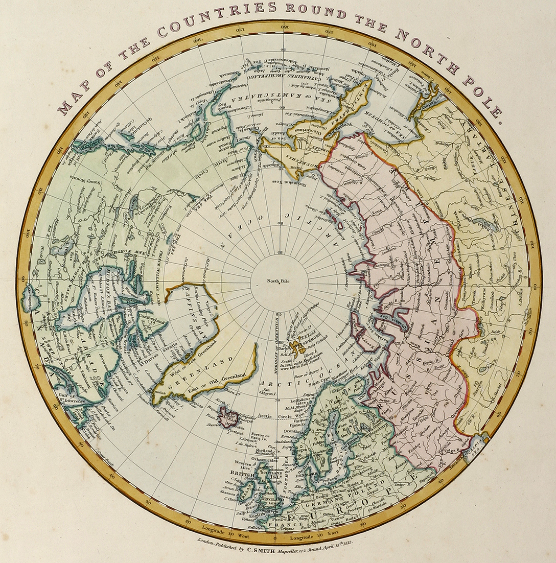 Well engraved and detailed map of the North Pole. Explorer dates noted.