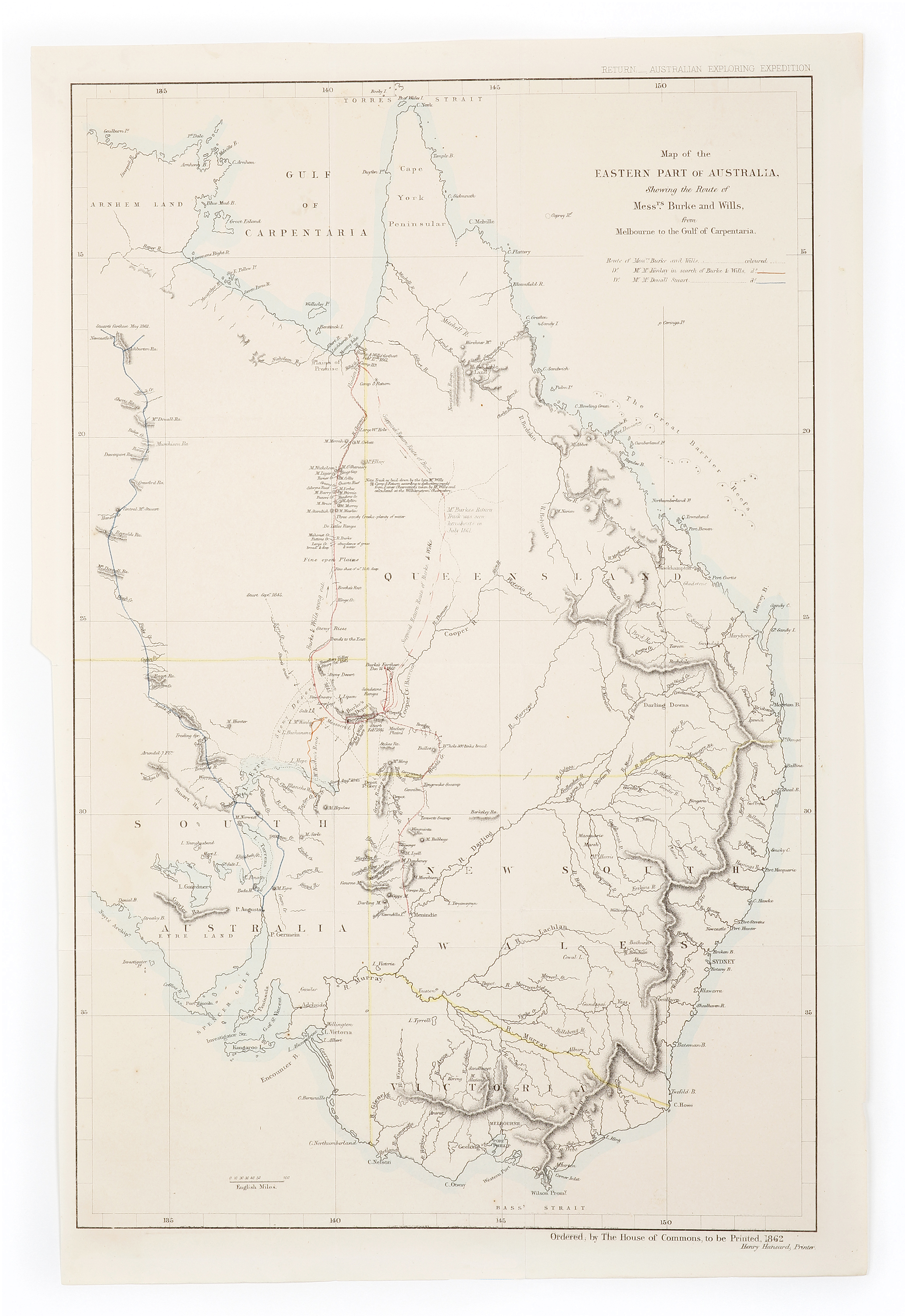 Rare inland exploration map from the official British report on the fate of the Burke and Wills expedition, printed by Henry Hansard. Shows Eastern Part of Australia, with the routes of Burke and Wills, from Menindie to the Gulf of Carpentaria … Read Full Description