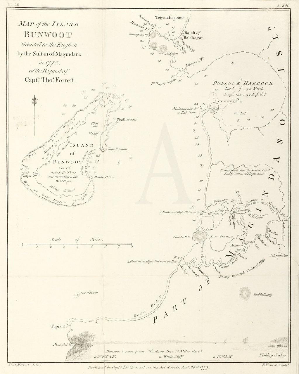 Forrest was an English navigator who worked for the British East India Company and in 1762 had command of a Company ship. In 1770 he was engaged in forming the new settlement at Balambangan, which had been recommended by Alexander Dalrymple and in 1774 took on an exploring mission in the direction of New Guinea. He sailed on 9 December in the Tartar, a local boat of about ten tons burden, with two English officers and a crew of eighteen Malays. In this, accompanied during part of the time by two small boats, he pushed his explorations as far as Geelvink Bay in New Guinea, examining the Sulu Archipelago, the south coast of Mindanao, Mandiolo, Batchian, and particularly Waygiou, of which his was the first good chart. Forrest reached Dorei Harbour, and returned to Achin in March 1776. He was said to have died in India in about 1802.