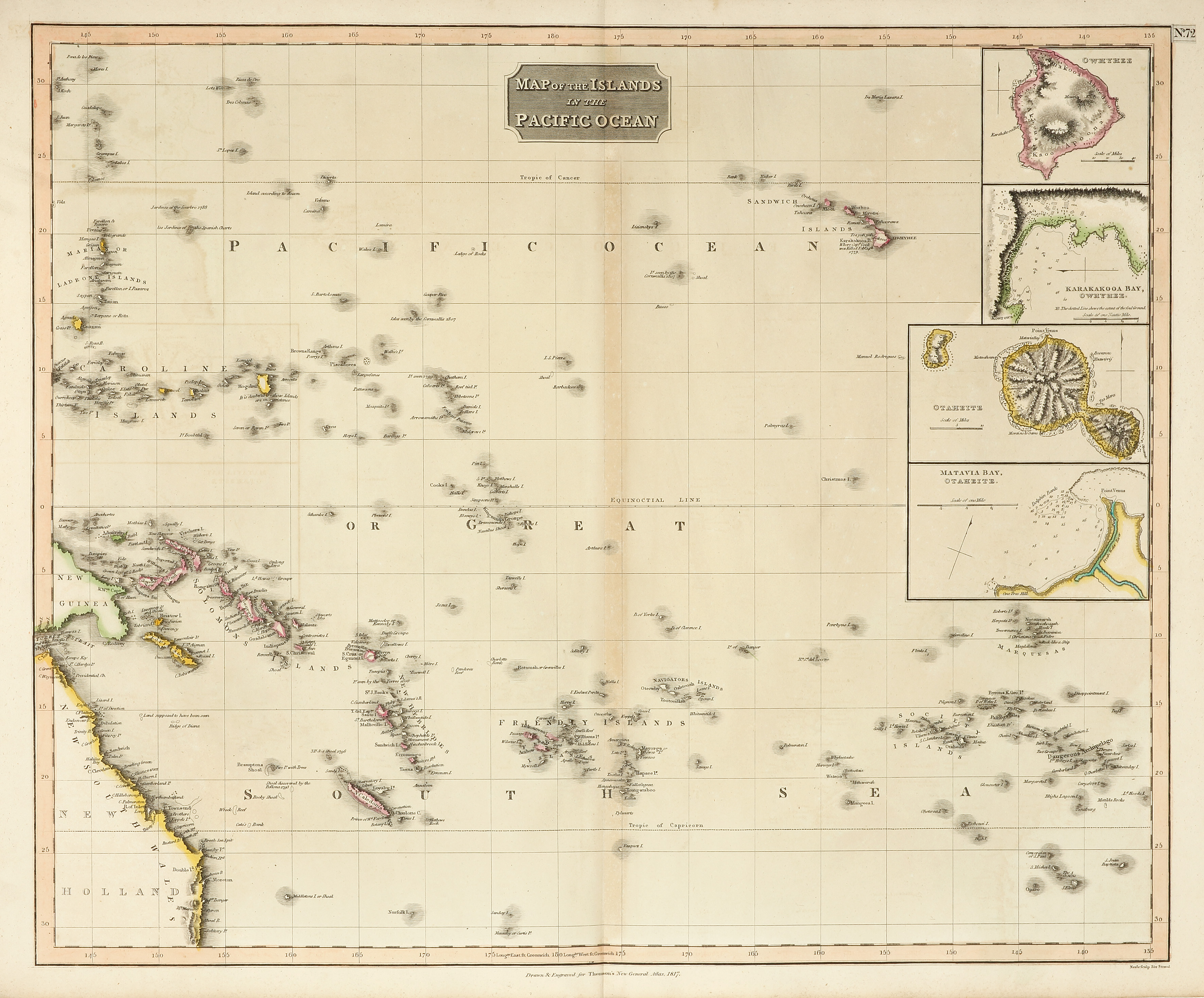 Early issue of this detailed large scale chart of the Pacific, with insets of Owhyhee, Karakakooa Bay, Otaheite and Matavia Bay. Thompson’s maps are often incorrectly dated as they show a publication date of 1814 but were in fact issued … Read Full Description