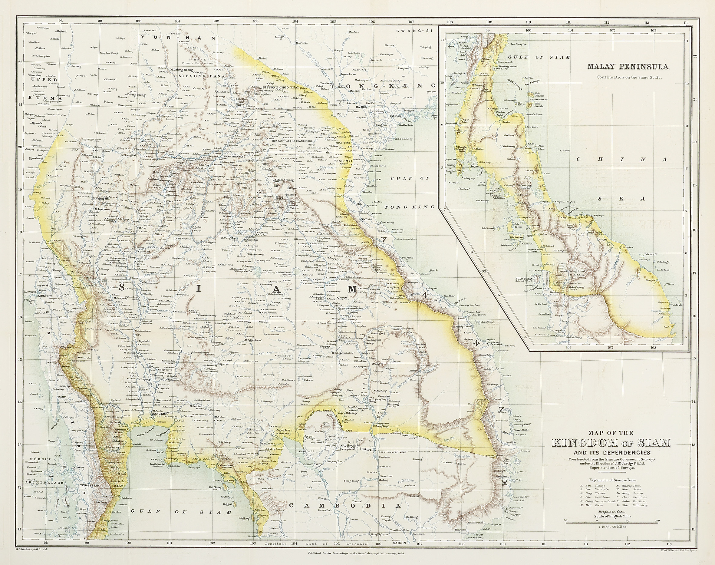 McCarthy conducted the first scientific survey of Thailand on behalf of the government, producing this very detailed map. The map has an inset of the Malay peninsula at top right.