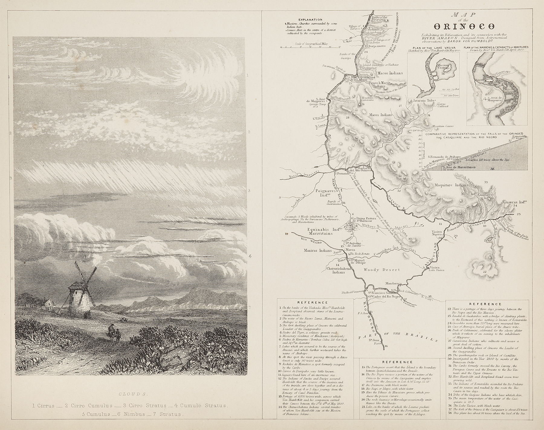 Scarce c.19th map of the Orinoco, as well as its tributaries in the eastern llanos such as the Apure and Meta, which were explored in the c.16th by German expeditions under Ambrosius Ehinger and his successors. In 1531, starting at the principal outlet in the delta, the Boca de Navios, Diego de Ordaz sailed up the river to the Meta. Antonio de Berrio sailed down the Casanare to the Meta, and then down the Orinoco River and back to Coro. In 1595, after capturing de Berrio to obtain information while conducting an expedition to find the fabled city of El Dorado, the Englishman Sir Walter Raleigh sailed down the river, reaching the savanna country. Alexander von Humboldt explored the basin in 1800, reporting on the pink river dolphins. He published extensively on the river’s flora and fauna.
