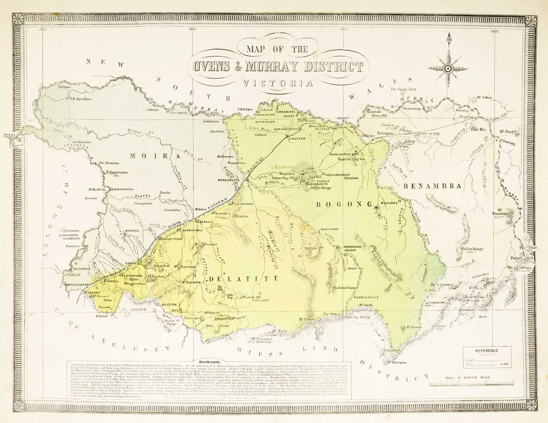 Scarce c.19th hand coloured map of the Ovens and Murray River district of Victoria, from the first county atlas published of the state. The map extends west to Rushworth, to Forest Hill in the east and north to Corowa and south to Delatfie River. Roads and pastoral runs are shown. Surrounding the map are detailed lists of Creeks, Stations, Post Towns and Mountains.