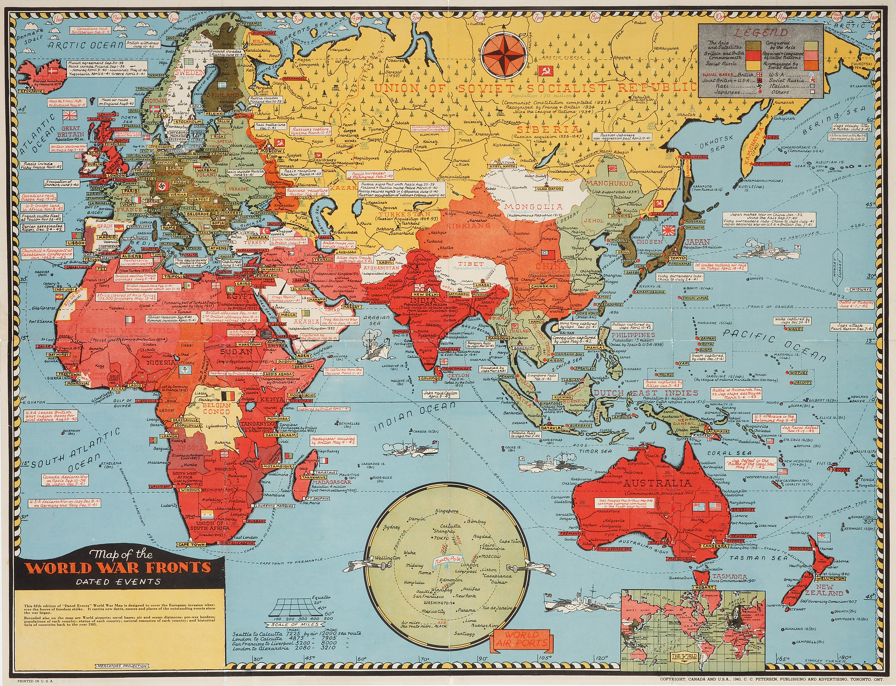 Fifth edition of this map which has updates to May 11th, 1943 and takes into account the most recent developments during World War II. Includes two inset maps: a world map and world air ports.