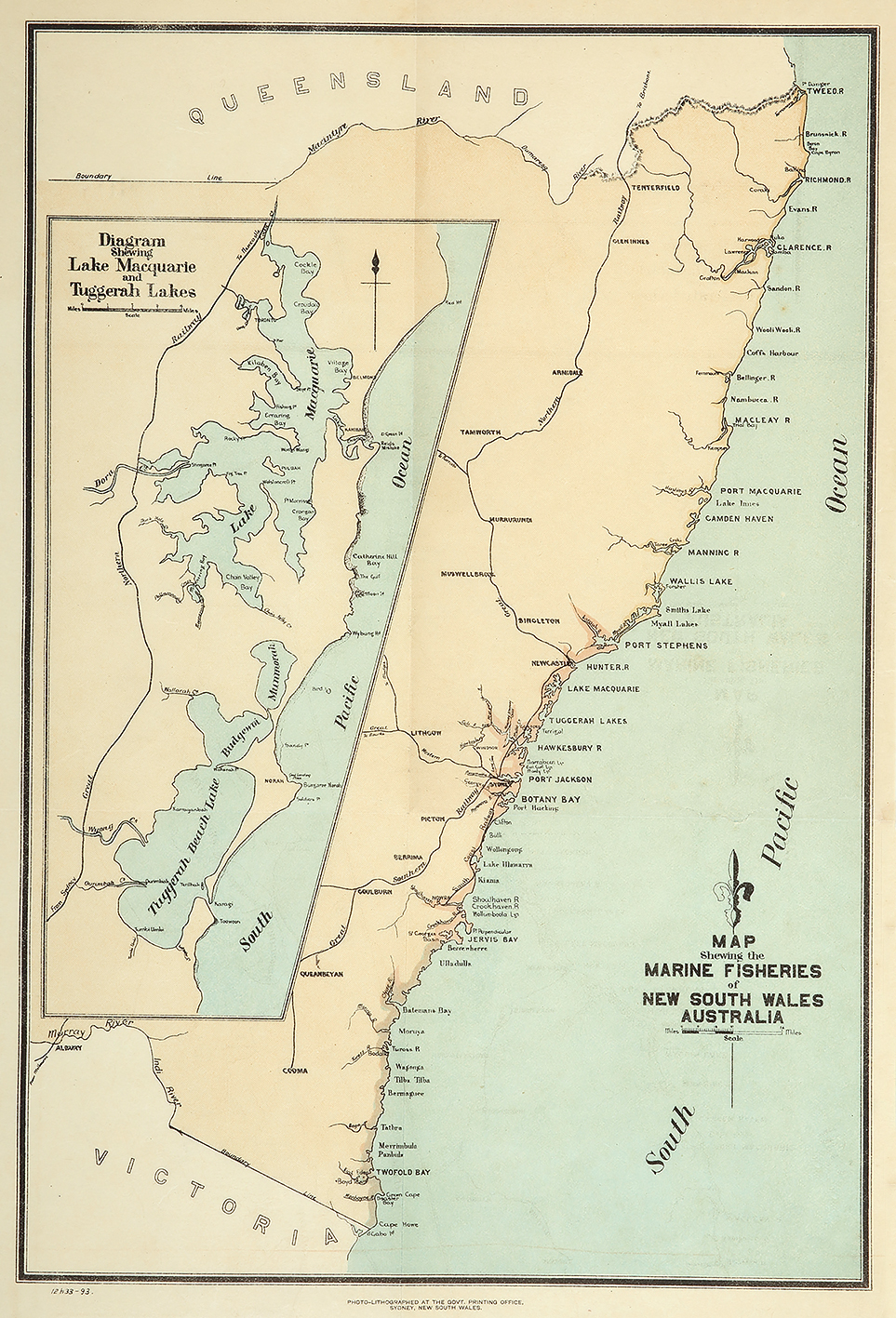 Scarce c.19th colour lithographic map extending from the Tweed River to Cape Howe, showing the fisheries of New South Wales.