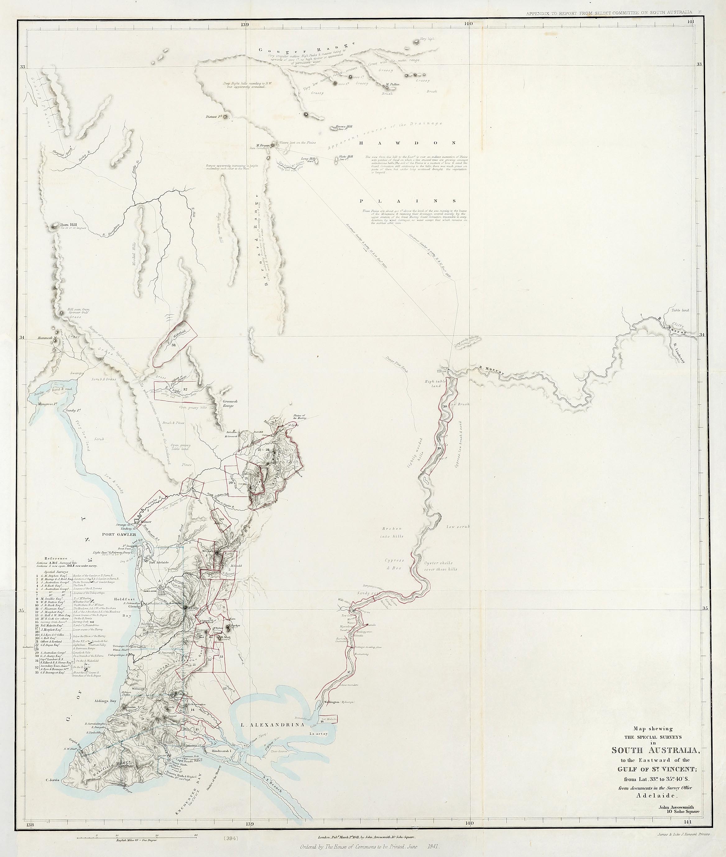 The map depicts South Australia from the Gouger Ranges in the north, to the Coorung in the south and from Mangrove Point (just north of Moonta) in the west, to River Lindesay in the east. The map illustrates key topographical features, including river systems, mountain ranges, and notable natural landmarks. Of particular interest are the delineated Special Surveys, which are accompanied by a legend listing the names of the purchasers at lower left. The map offers valuable insight into the geographical knowledge and extent of exploration in South Australia since its establishment in 1836. It documents early discoveries such as the Finniss River and Currency Creek in 1837, the South Parra or Gawler River in the same year, and Edward Eyre’s discoveries of the River Broughton and Crystal Brook in 1839 and 1840 respectively. Also marked is Governor Gawler’s 1839 expedition to Mount Bryan, with routes shown departing from and returning to the Elbow or North West Bend on the River Murray. Some place names recorded on the map, such as Hawdon Plains and Gouger Range in the northern region, are no longer recognised.