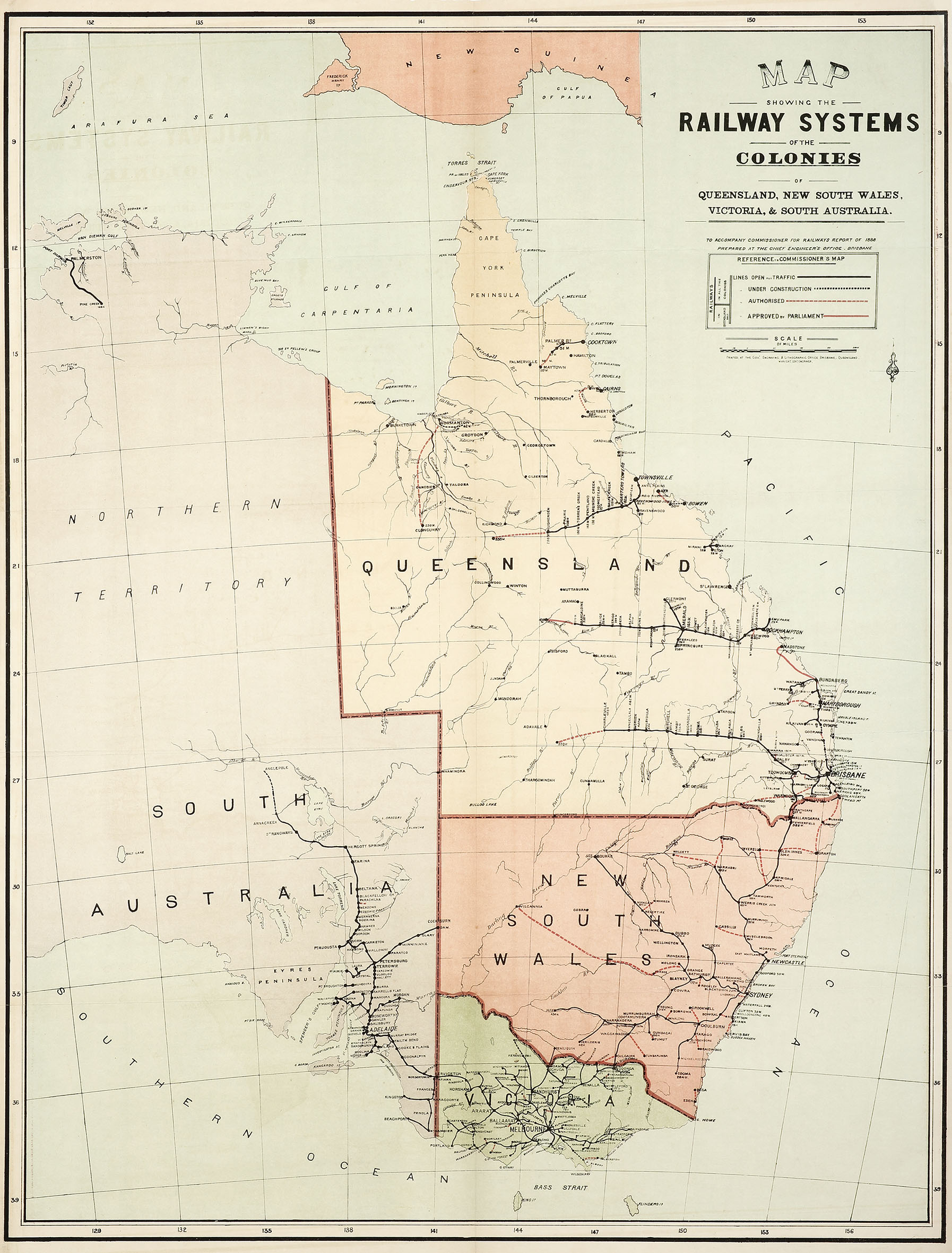 Large scale c.19th map of the railway systems of Queensland, New South Wales, Victoria and South Australia with a key showing operating lines, ones under constructions, authorised and approved by Parliament.