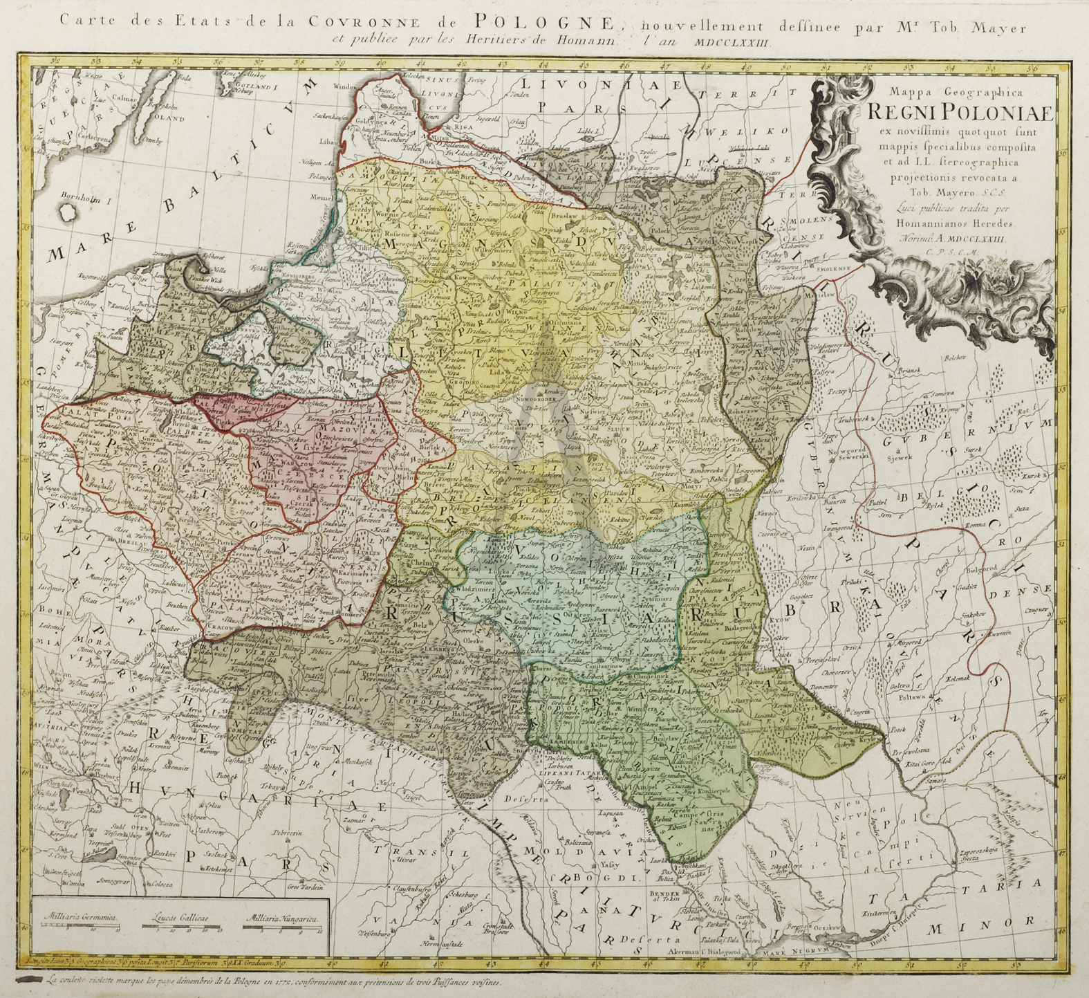 Poland extends from Glogau and Breslau in the West, to Braclaviensis in the South along the Dniestr River, east to the Dniepr River and Mscislaw and north to include parts of Lithuania, although Curland seperates Poland from the Lithuanian Sea. A notation on the map indicates that the regions colored in tobacco mark the countries dismembered from Poland in 1772.
