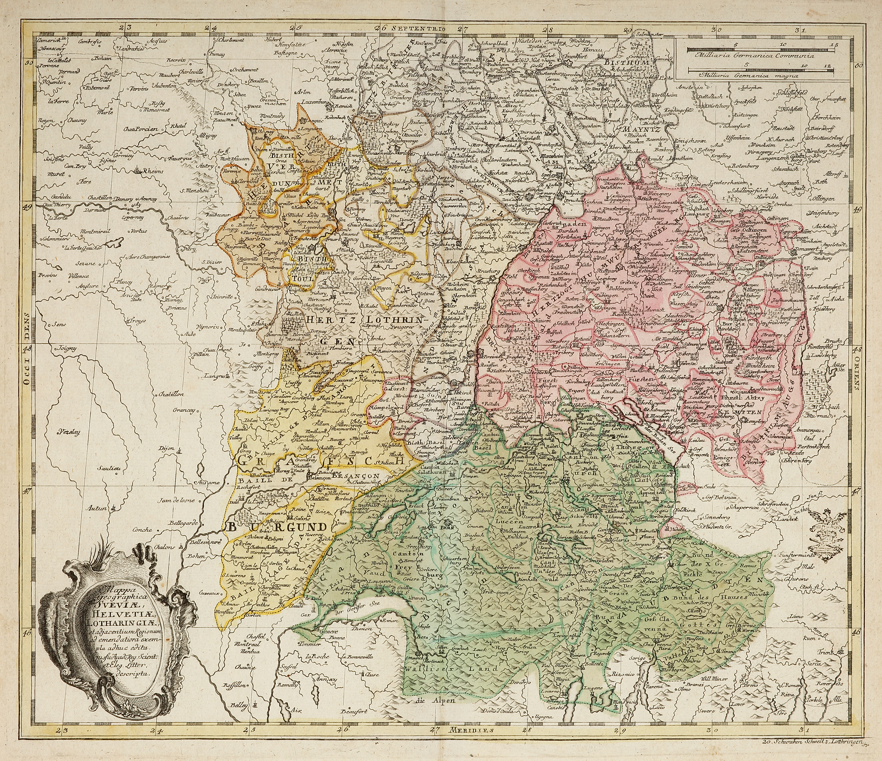 Rare map of Swabia in southwest Germany, Switzerland and Lorraine with an elaborate Rococo style title at lower left and a scale of distances at top right. From, Euler’s, Atlas geographicus omnes orbis terrarum regiones…
