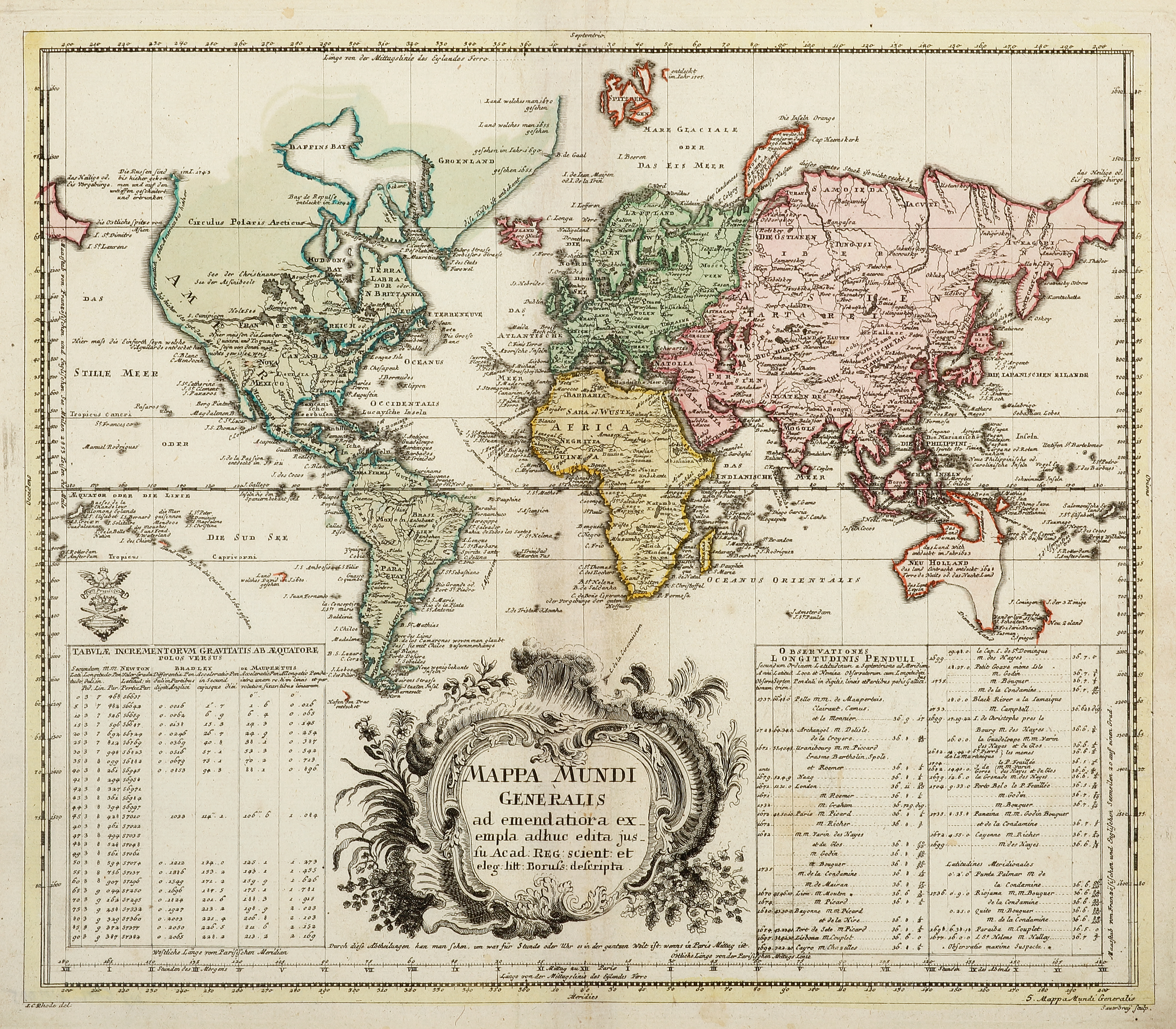 Rare c.18th world map on Mercator’s Projection with a decorative title placed between two tables.