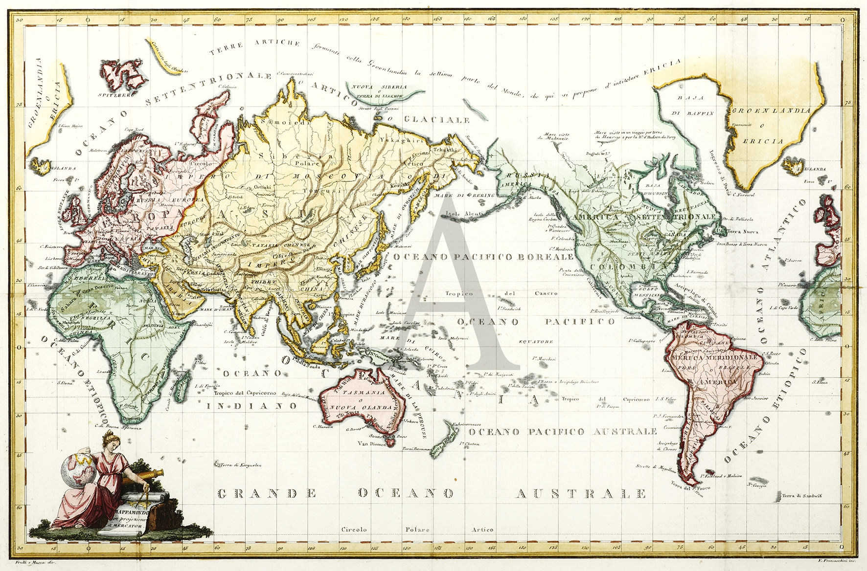 Interesting Italian map of the world with decorative title cartouche of Europa holding the world. Australia name "Nouval Olanda", and shown with southern coast "Terre Napoleon".
