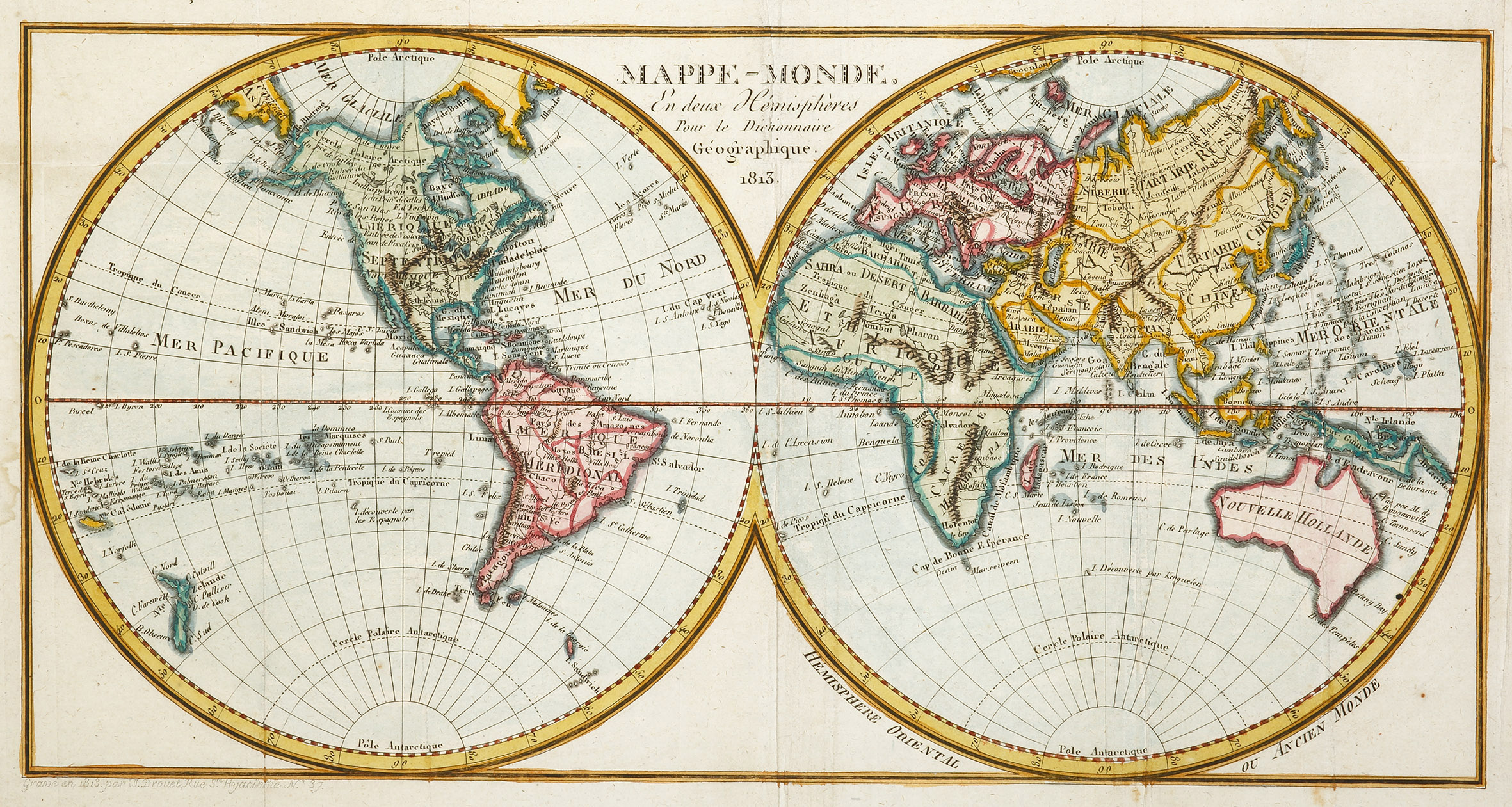 Double hemisphere French world map with a crudely shaped Australia with the east coast based on Cook’s discoveries. Tasmania is shown joined to the mainland although Bass Strait had been discovered by Bass and Flinders and a chart made by Aaron Arrowsmith in 1798 . The Hawaiian islands are also shown.