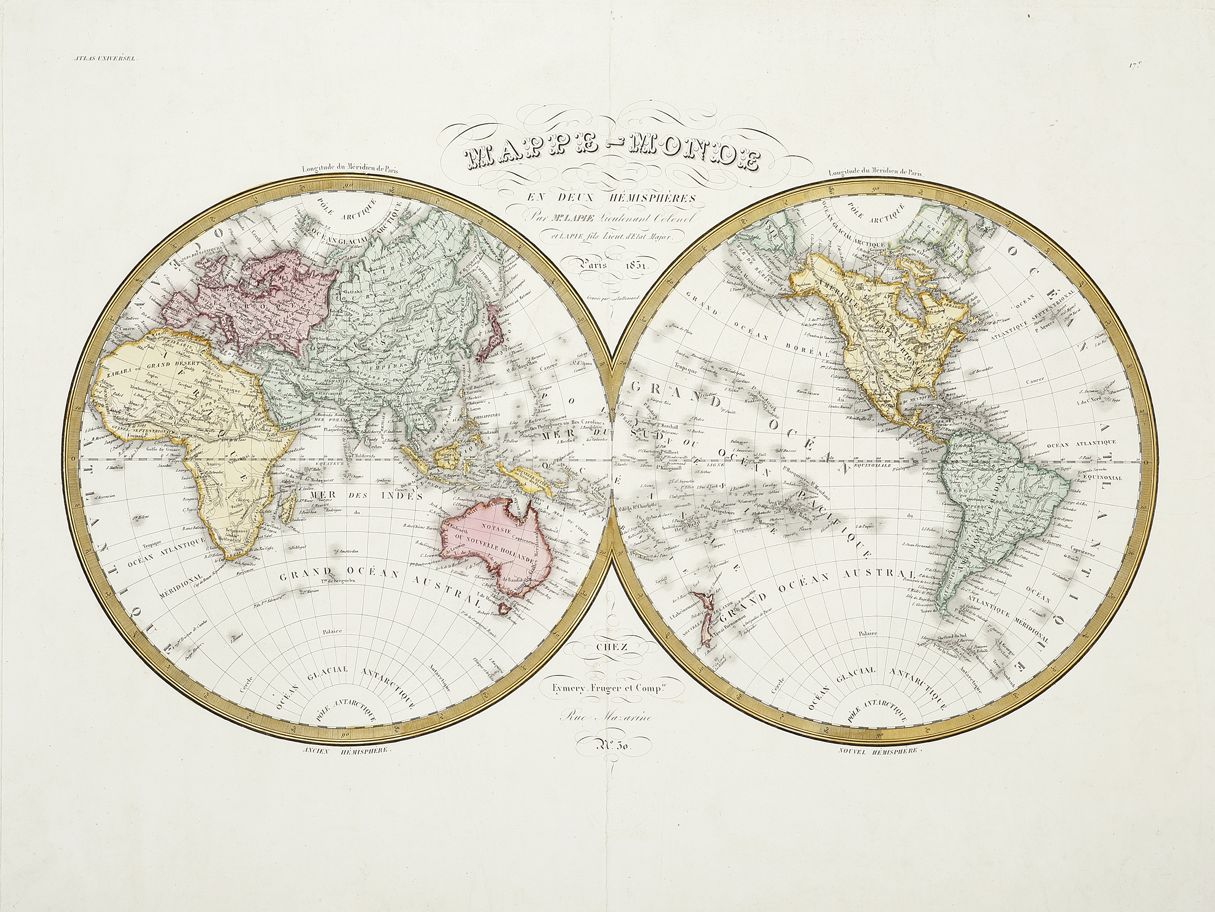 First edition, of this large double hemisphere world map by Pierre Lapie (1779-1850) dated 1831 which includes all the results from the great French voyages of discoveries; including the voyages of Nicholas Baudin and Dumont D’Urville.