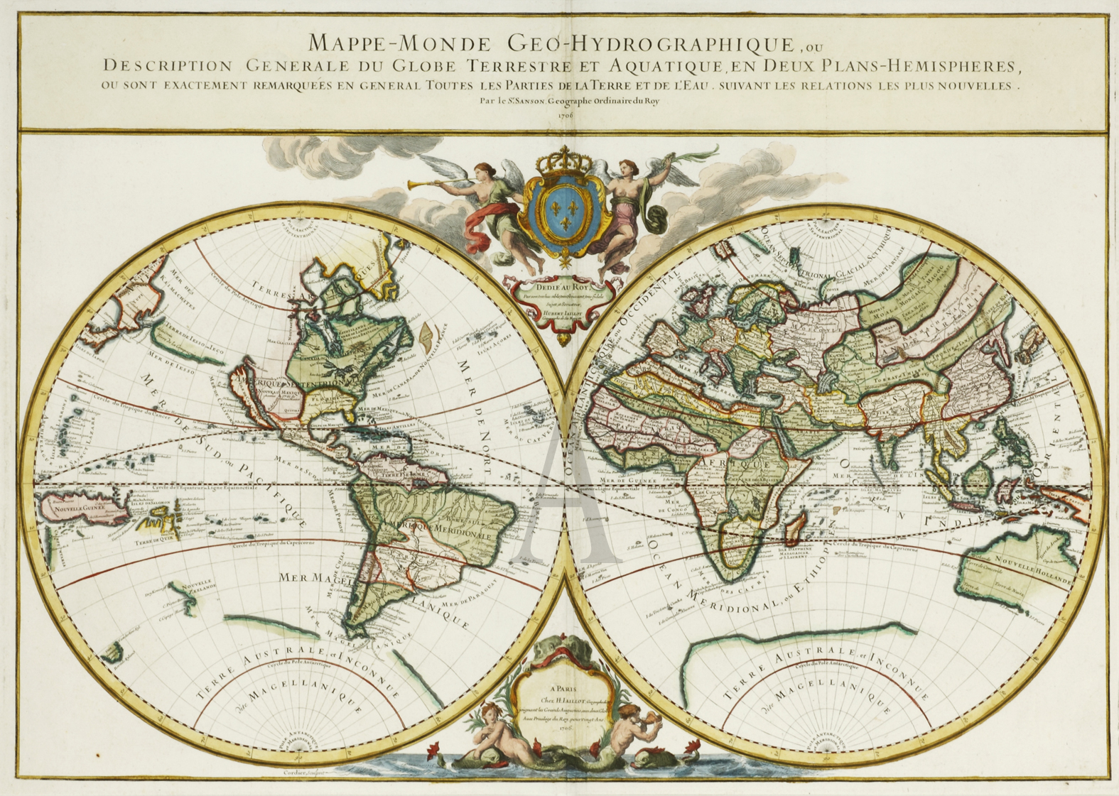 Elegant double-hemisphere world map with a dedication to the Sun King, Louis XIV, by Hubert Jaillot, featuring two decorative cartouches at the top and bottom. Centre left is the figure of Pheme, the goddess of fame and on the right is Nike the Goddess of strength, speed and victory, both holding the French Royal Arms of France Moderne . The lower cartouche features Jaillot’ royal privilege and is bordered on the right by the figure of Triton, a fish-tailed sea god who was the son of Poseidon, king of the seas. Triton stilled the waves with the blow of a conch-shell while to the left is the goddess Aphrodite Derceto represented as a mermaid holding a fish as a symbol of the fertility and life of water. The map was engraved by Louis Cordier with the geographical information provided by Nicholas Sanson, Geographer to the King, and widely considered to be the father of French cartography. Jaillot played an important role in continuing Sanson’ legacy. Following Sanson’ death in 1667, the business was inherited by his sons Adrien and Guillaume who partnered with Jaillot and his contemporary Pierre Duval to publish Sanson’ maps. The first such publication was Jaillot’ Atlas Nouveau of 1692. The map shows Australia according to Tasman’ first and second voyages 1642-44 and includes the earlier Dutch discoveries made by Houtman 1619, van Leeuwin 1622, Nuyts 1627 and de Wit 1628. The Trial Islands 1622 are also included but incorrectly placed. California is shown as an island. The first state of this map was published in Jaillot’ Atlas Francois of 1695. In the early states, the last digit of the date was not engraved and was intended to be entered in manuscript. The geography of the map shows no distinct changes from Jaillot’ world map of 1674 but the decorative cartouches between the hemispheres are very different. This is a later state of this map, issued in 1706 and dated as such on the engraving plate. The later editions are also known for the inclusion of the words ‘ de sa Majest�’ which appears beneath Jaillot’ inscription in the dedication. References: Shirley 569, ill.pl.392 (1695).