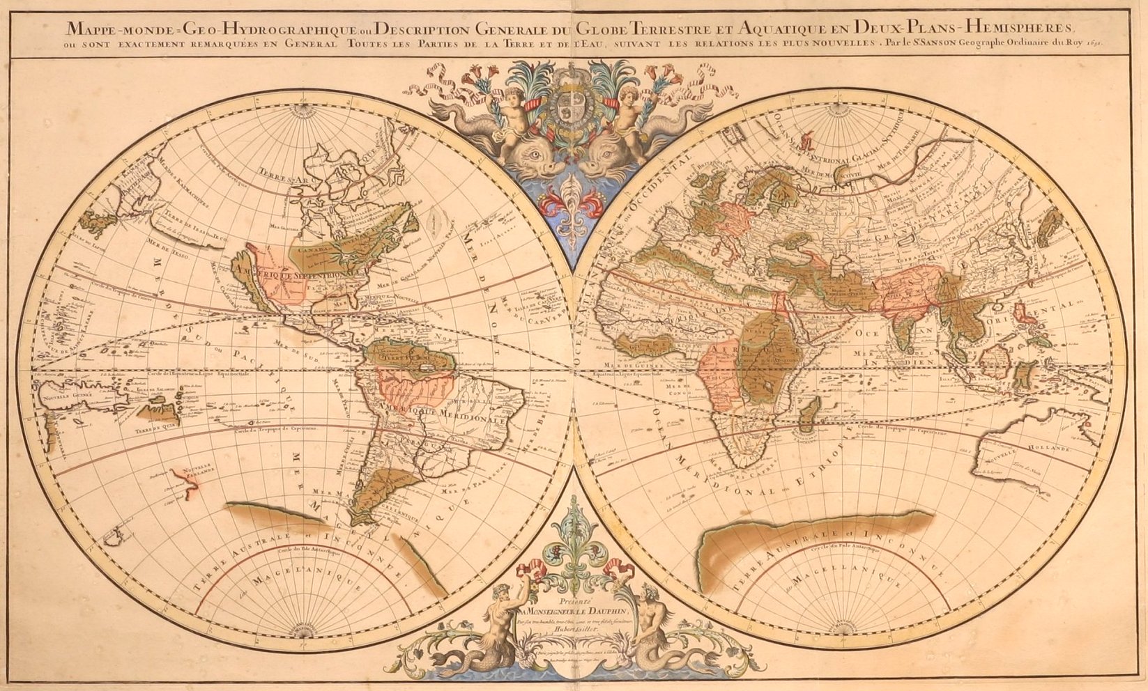 Impressive double hempisphere two sheet map of the world by Jaillot after Sanson. Decorated at the top with cherubs with flowing banners astride dolphins which support the arms of France. At the bottom a bold cartouche is flanked by two twin tailed mermen. Australia is shown according to Tasman and California is shown as an island. Shirley 550