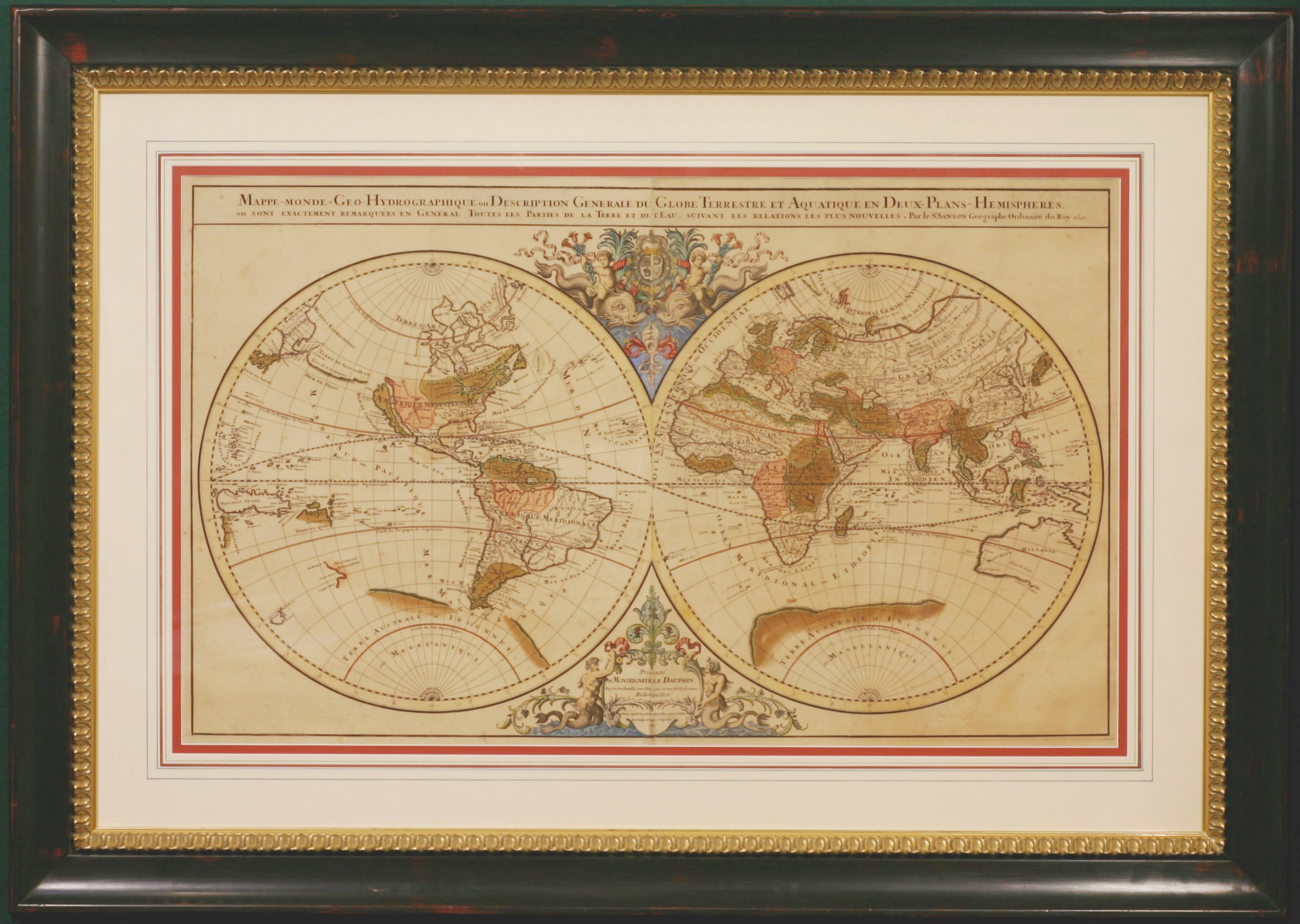 Impressive double hempisphere two sheet map of the world by Jaillot after Sanson. Decorated at the top with cherubs with flowing banners astride dolphins which support the arms of France. At the bottom a bold cartouche is flanked by two … Read Full Description