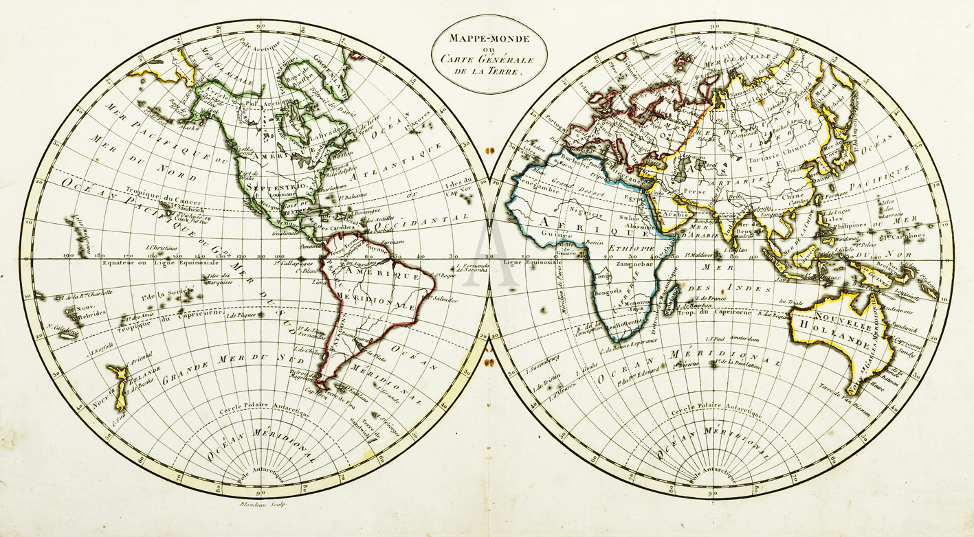 Double hemisphere world map showing Australia with the east as charted according to Cook and not showing the discoveries of Bass, Baudin and Flinders on the southern coasts.