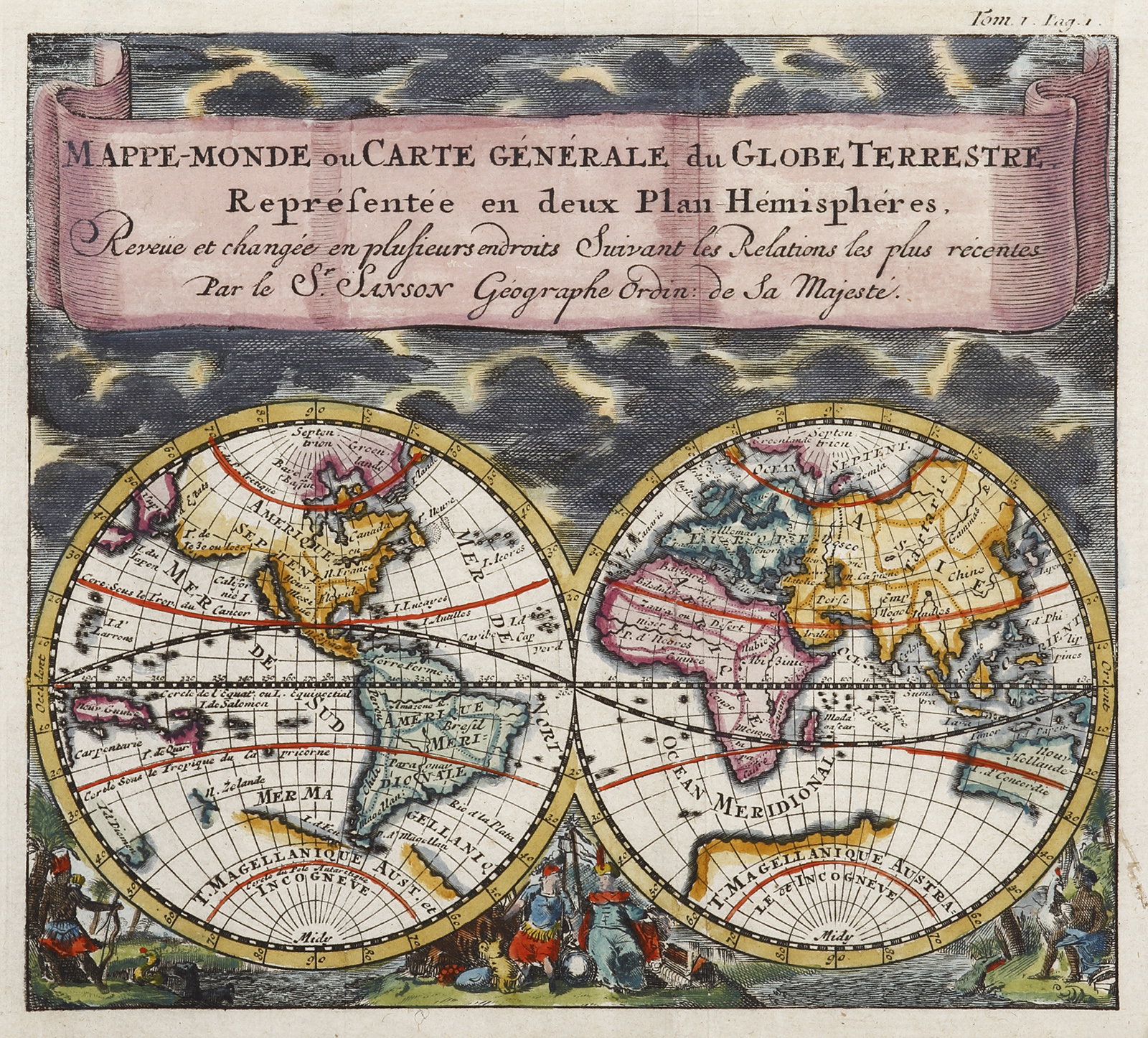 Rare c.17th world map by Sanson, superbly embellished with a scrolled title banner and representations of the continents at bottom. Australia and New Zealand are shown with the discoveries made by Able Tasman on his two voyages of exploration 1642-3. … Read Full Description