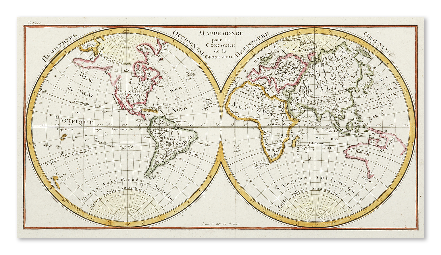 French double hemisphere world map with Australia and New Zealand shown according to the discoveries made by Abel Tasman on his two voyages of exploration in 1642-4 and with an imaginary east coast extending from Van Diemen’s Land to New Guinea. This depiction of the Australian continent was promoted by the French School of Theoretcial Geography.