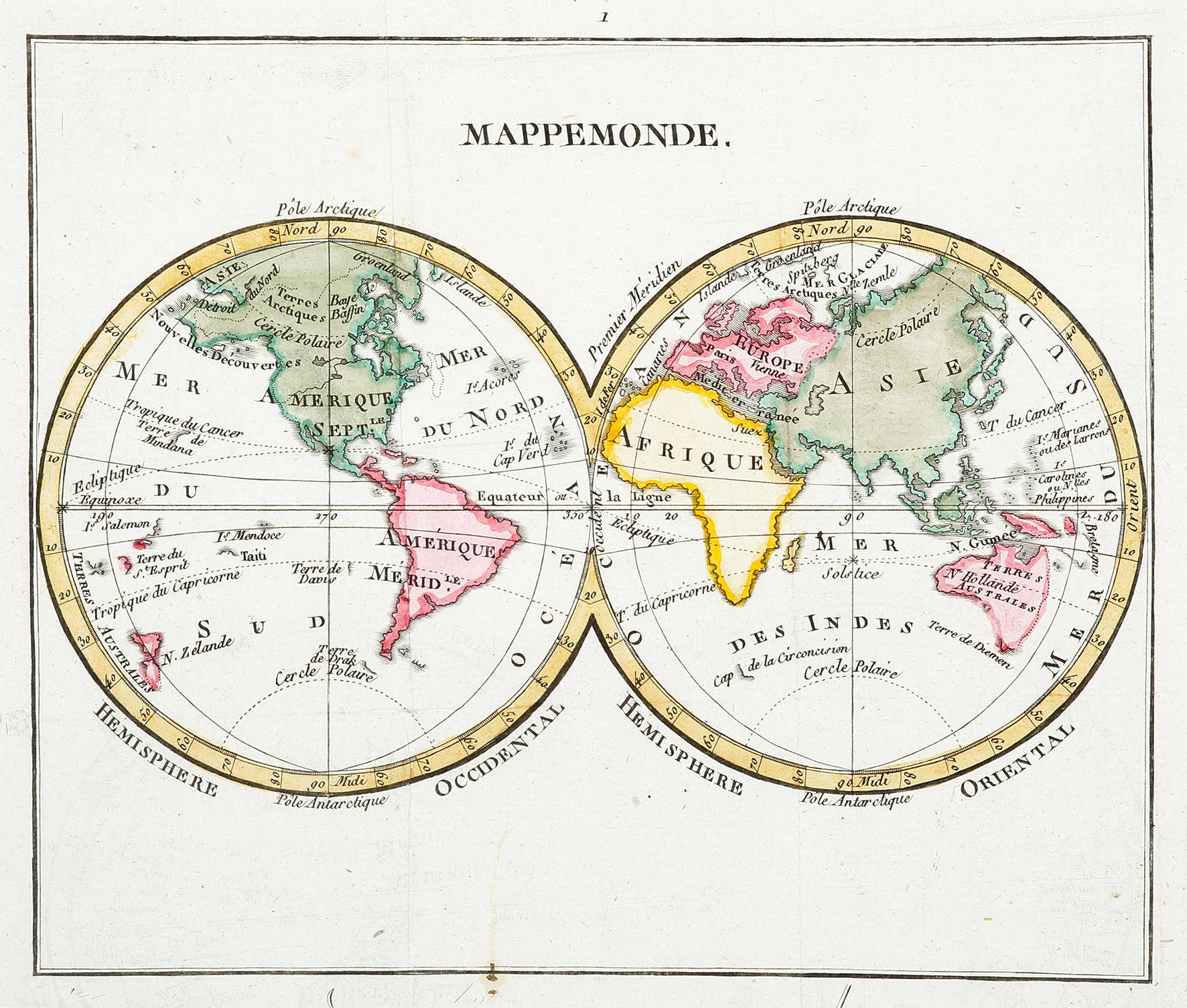 Double hemisphere French world map. Australia is shown with an imaginary east coast and prior to its discovery by James Cook’s and the charting of Bass Strait by Flinders and Bass. The east coast is shown according to the French School of Theoretical Geography, that proposed that the the Australian east coast continued from Van Diemen’s Land to the Solomon Islands.