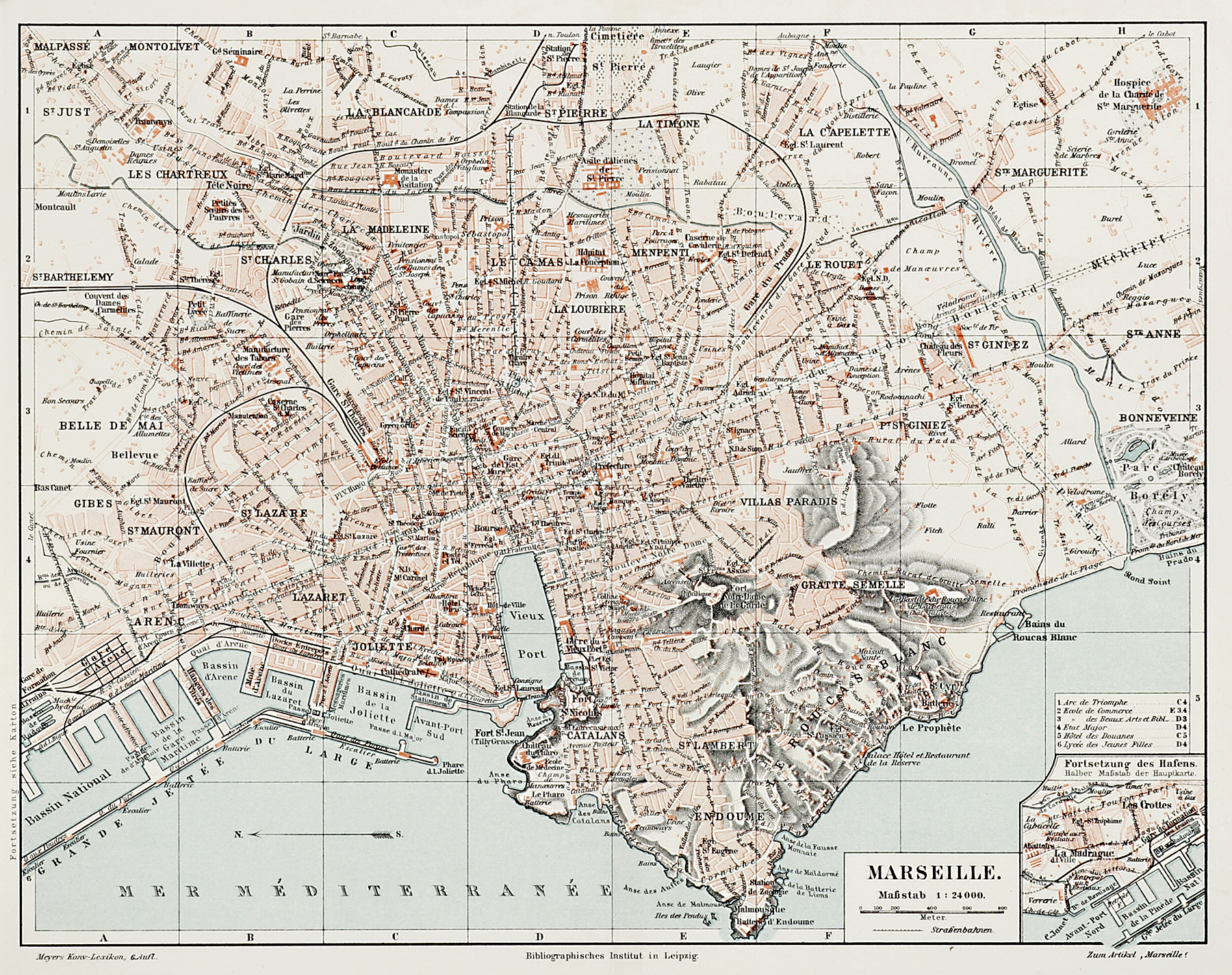 Detailed c.19th plan of Marseille with an inset of the continuation of the port at lower right.