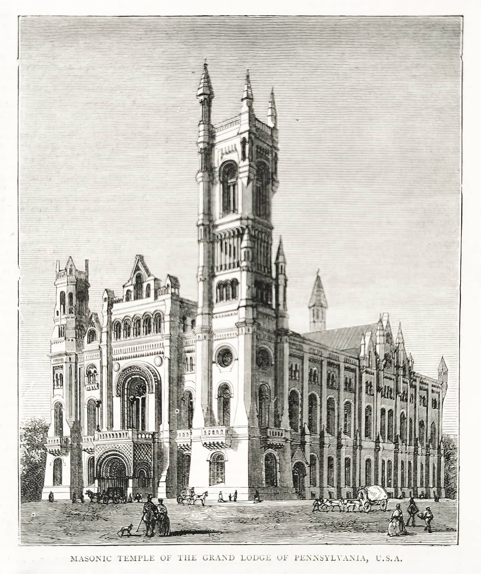 Engraving of the Masonic Temple of the Grand Lodge of Pennsylvania, USA.