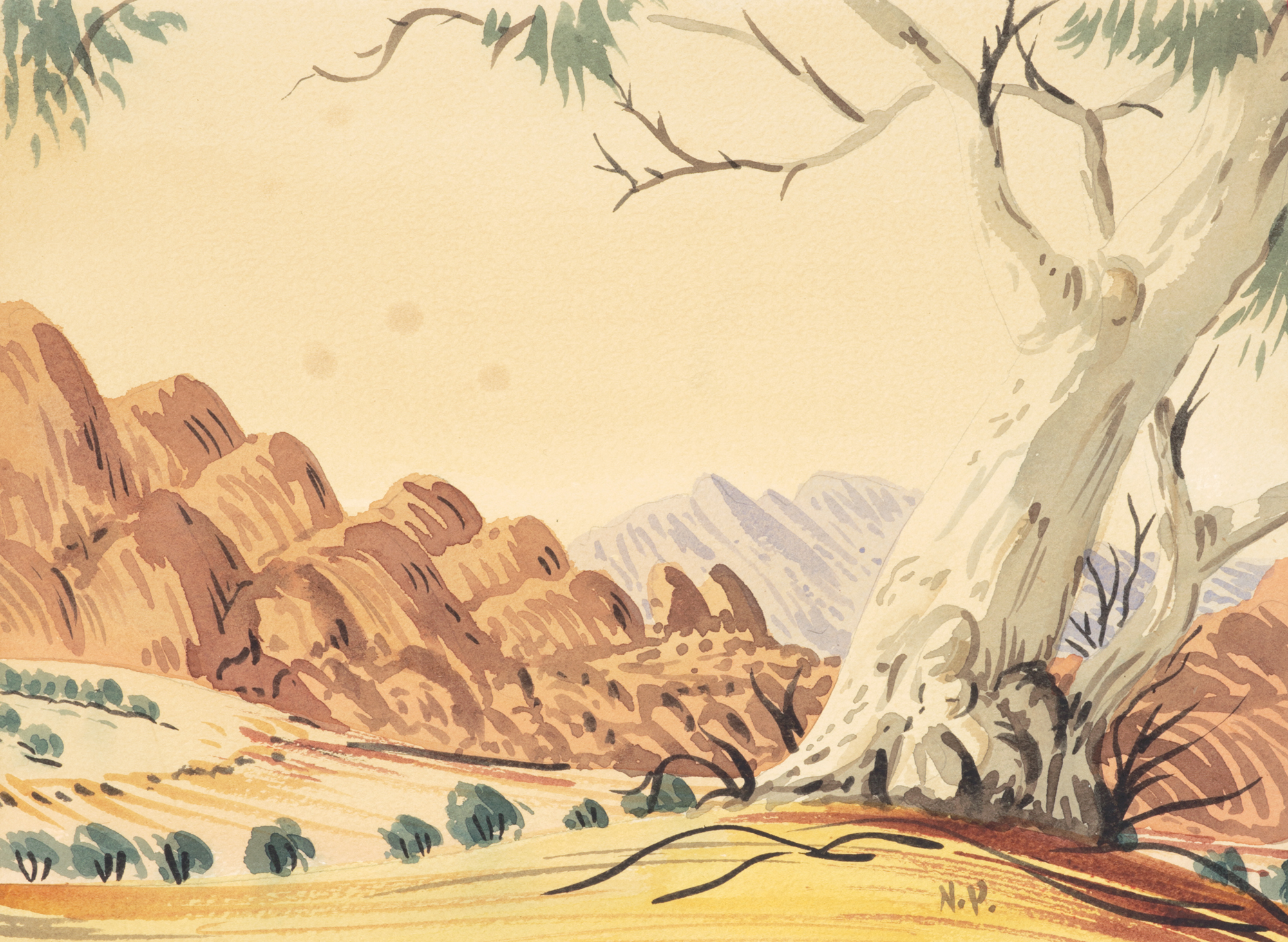 The Hermannsburg painters’ work is characterised by soft hues of their Western Arrernte landscape, which European settlers named the Western Macdonnell Ranges. Previously, Western Arrernte people had only used art in a ceremonial sense, as topographical interpretations of their country and their particular Dreamings, painted using symbols. They conveyed this spiritual connection with the land which came from their intimate knowledge passed down for thousands of years. The Ghost Gum features prominently in the works, a sacred and important part of Western Arrernte mythology, often representing ancestral beings with body-like trunks and arm-like branches.