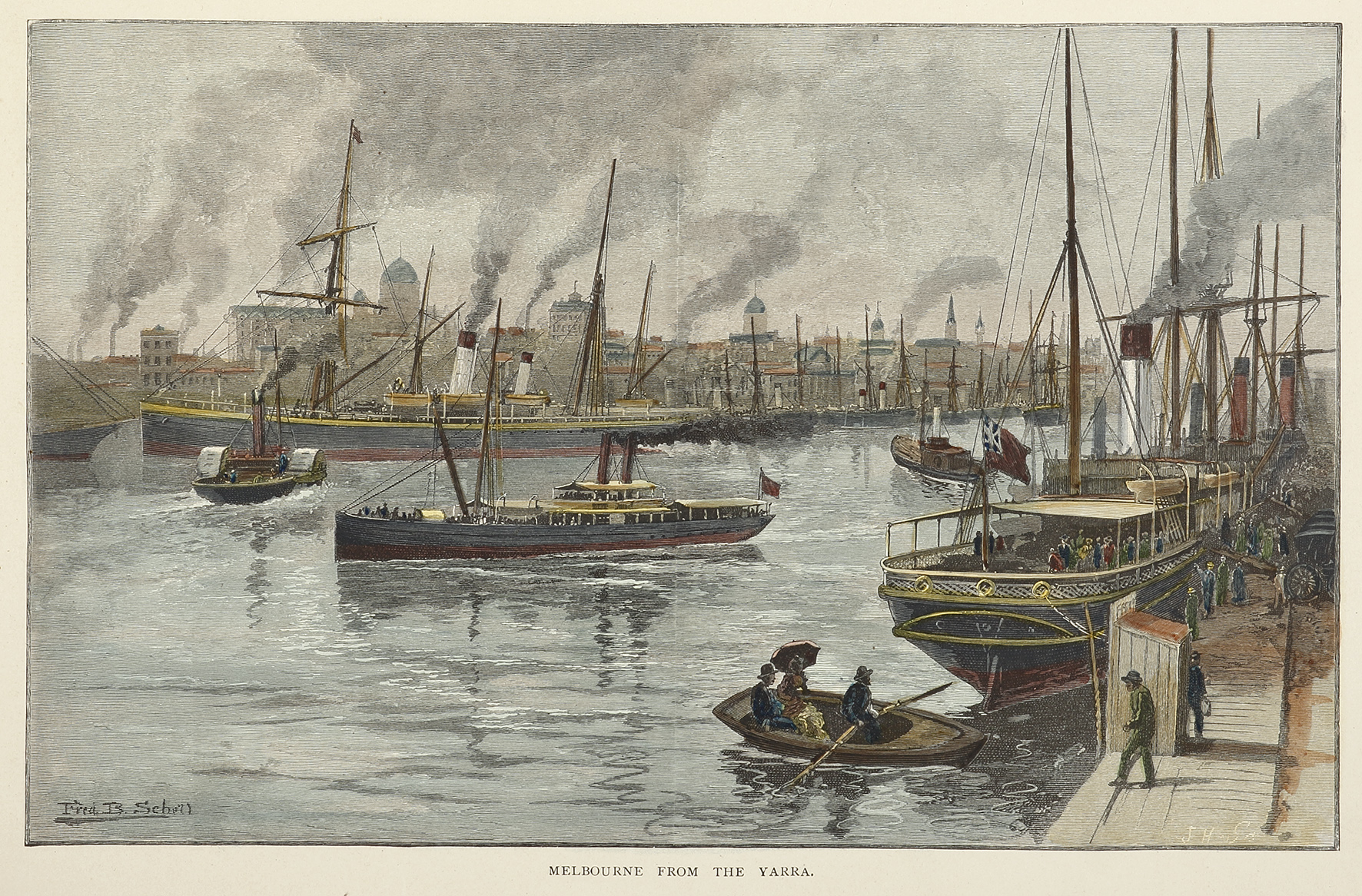 Lively c.19th scene showing shipping on the Yarra with Melbourne.