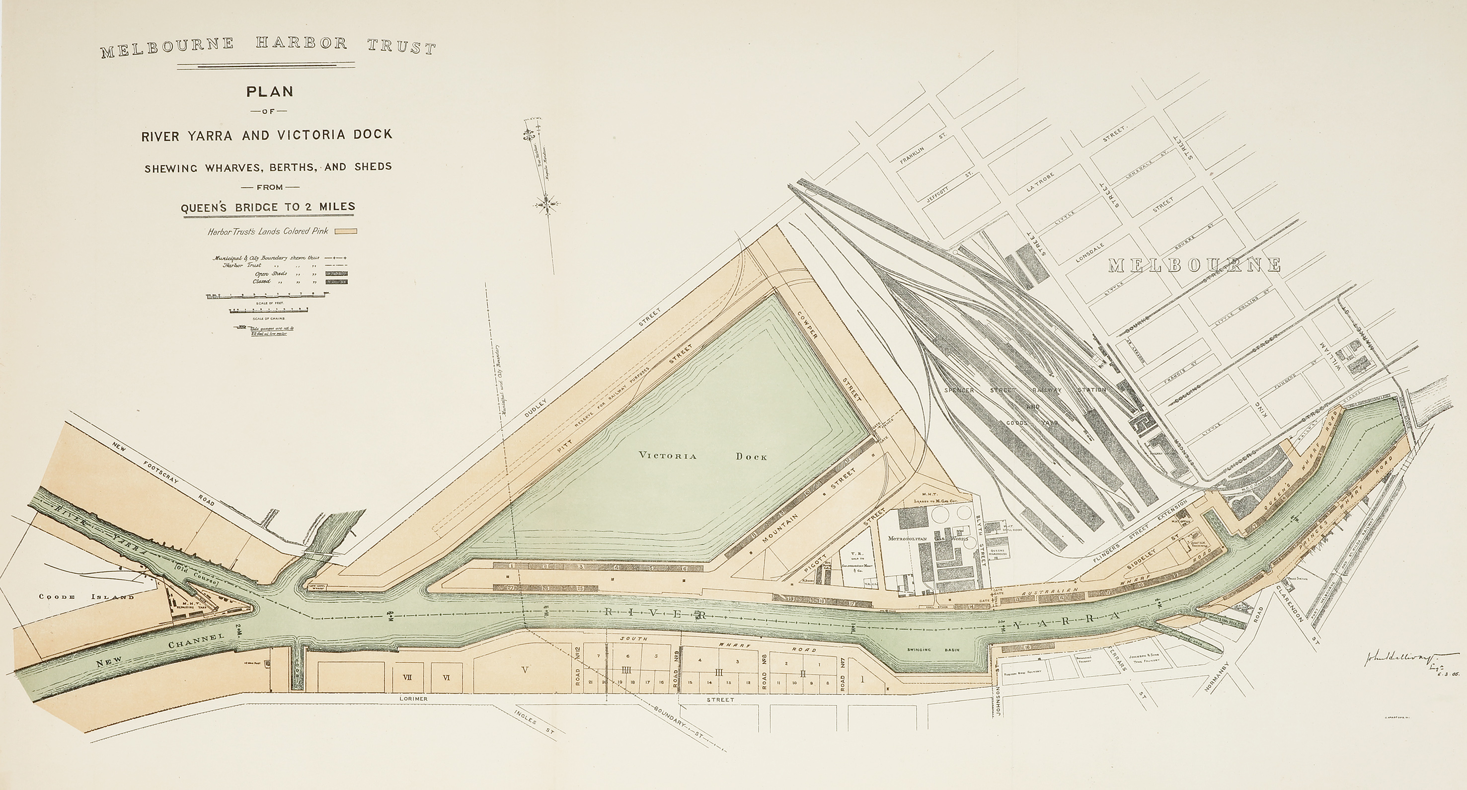 Detailed plan of Yarra Dock showing wharves, berths and shed improvements from Queen’s Bridge.