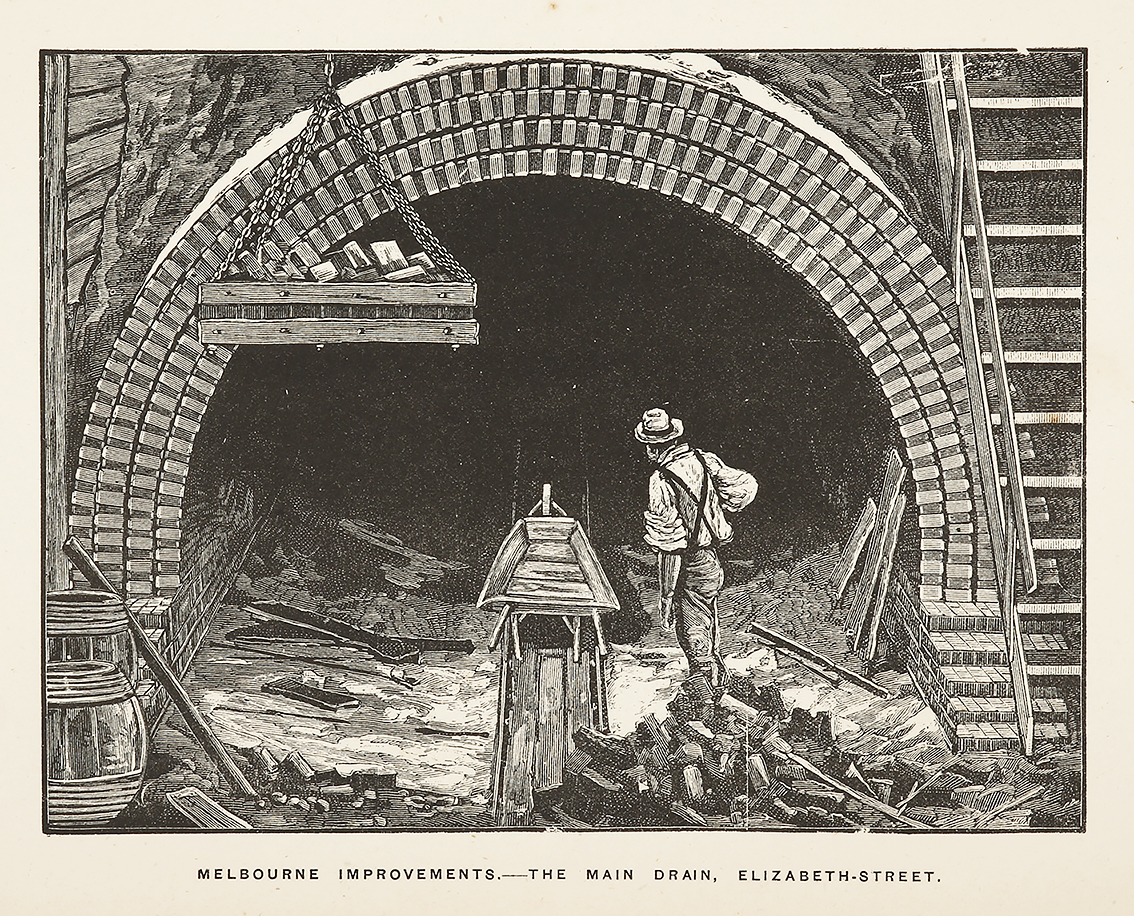 Scarce c.19th engraving showing improvements of the main drain in Elizabeth Street, Melbourne. Collections:State Library Victoria: MC 919.45 N42INational Library Australia: Bib ID: 2264805State Library New South Wales: 991021280379702626