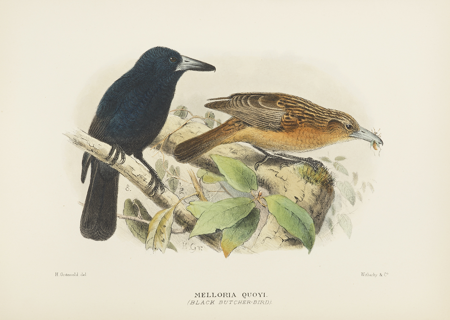 Superb lithograph with original hand colouring of the Black Butcherbird from the last great series on Australian ornithology, The Birds of Australia by G. Matthew’s.
