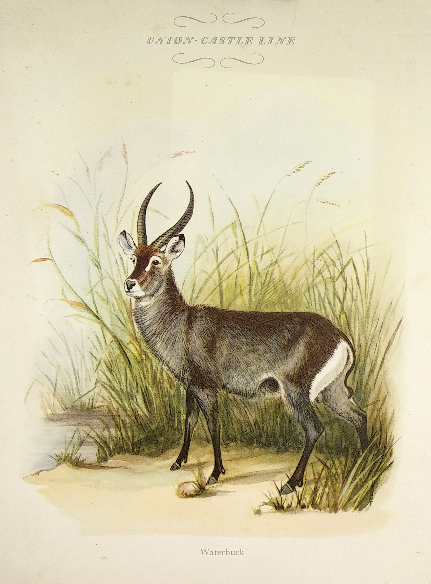 Dinner menu for the Union-Castle Line dated Tuesday 17th July, 1956, thick card 4pp. with front cover of a Waterbuck. The Union-Castle Line was a British shipping line that operated a fleet of passenger liners and cargo ships between Europe … Read Full Description