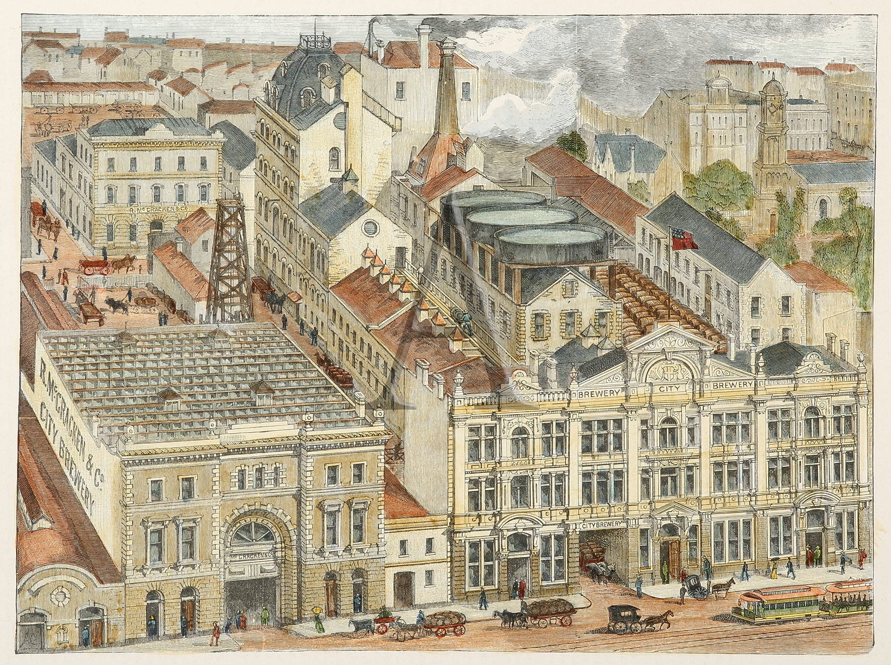 Scarce engraving of the colonial brewing company, McCraken’s, founded in 1851 on Collins Street, Melbourne. McCracken’s City Brewery operated until 1907