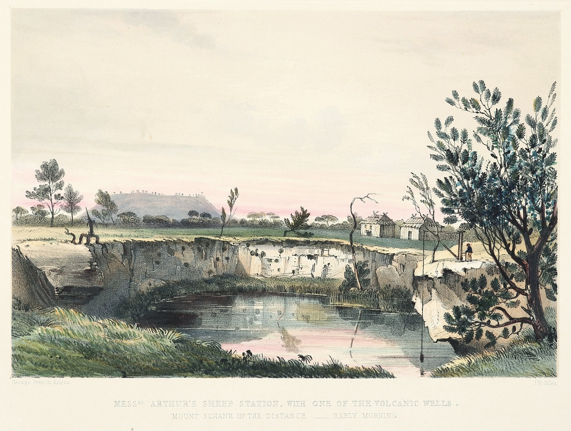 Rare c.19th hand coloured lithograph view of Messrs Arthur’s sheep station, with one of the volcanic wells and Mount Schank in the distance.