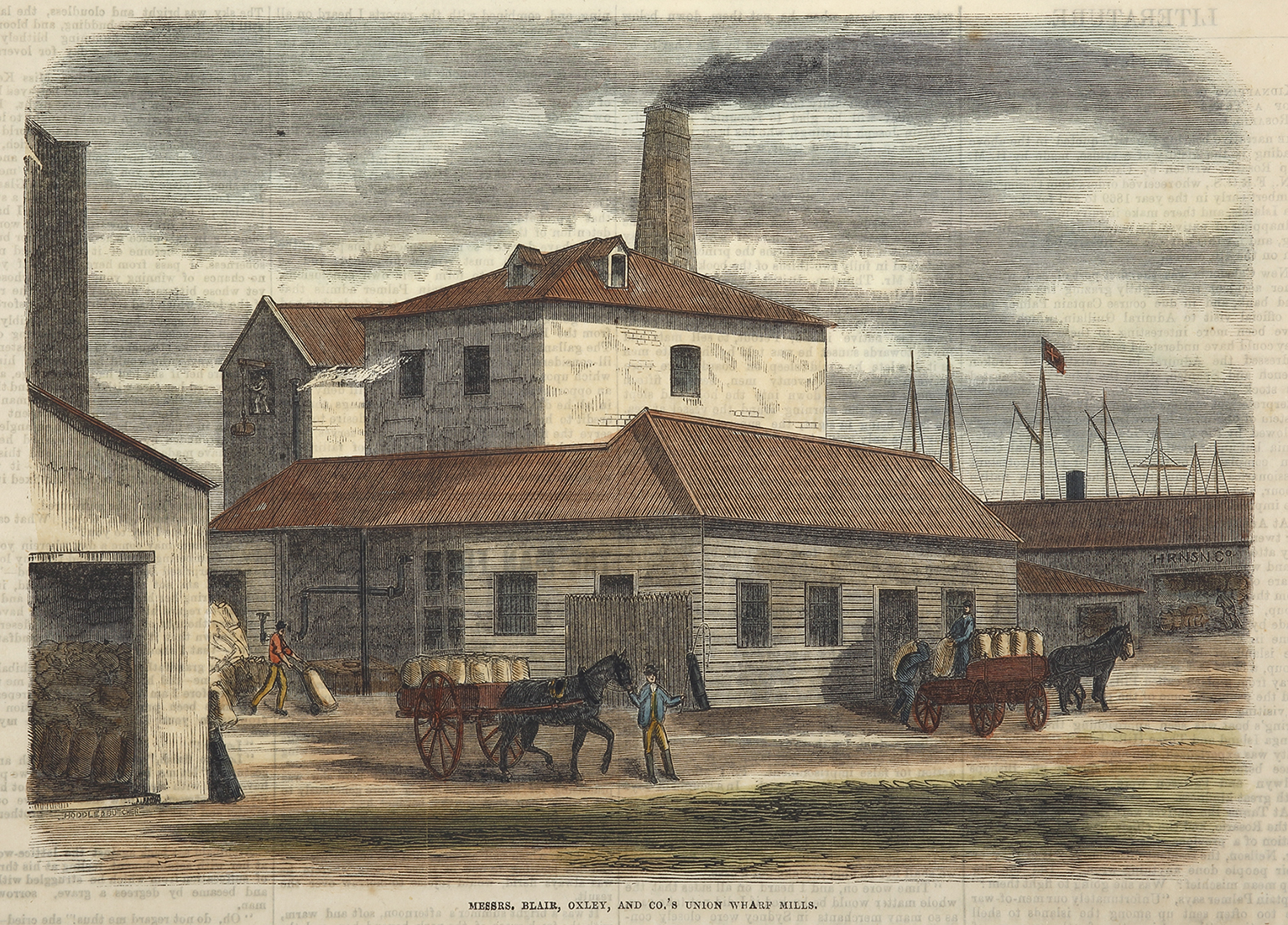 Rare engraved view of Blair, Oxley and Company mill at Sussex Street Sydney. The mill was established in 1854 by Archibald Blair to mill rice, flour, barley and spices.