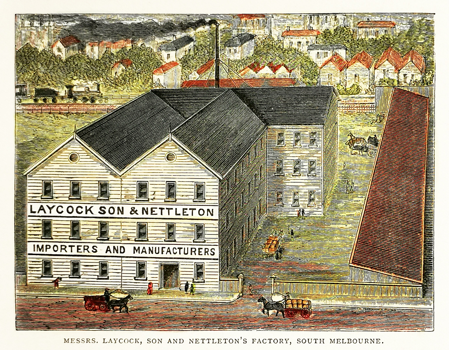 Fine colonial engraving of Laycock’s and Nettleton’s factory, Barkly Street, South Melbourne.