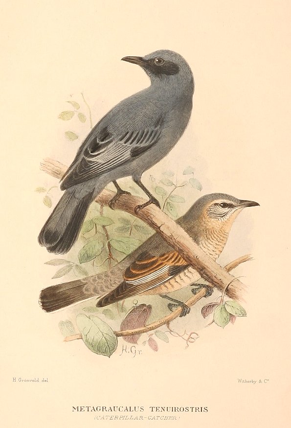 Superb lithograph of the Common Cicadabird with original hand colouring from the last great series on Australian ornithology, The Birds of Australia by G. Matthew’s. Common names: Common cicadabird, Slender-billed cicadabird Modern binomial name: Edolisoma tenuirostre First described: Jardine, 1831 Distribution: WA, … Read Full Description