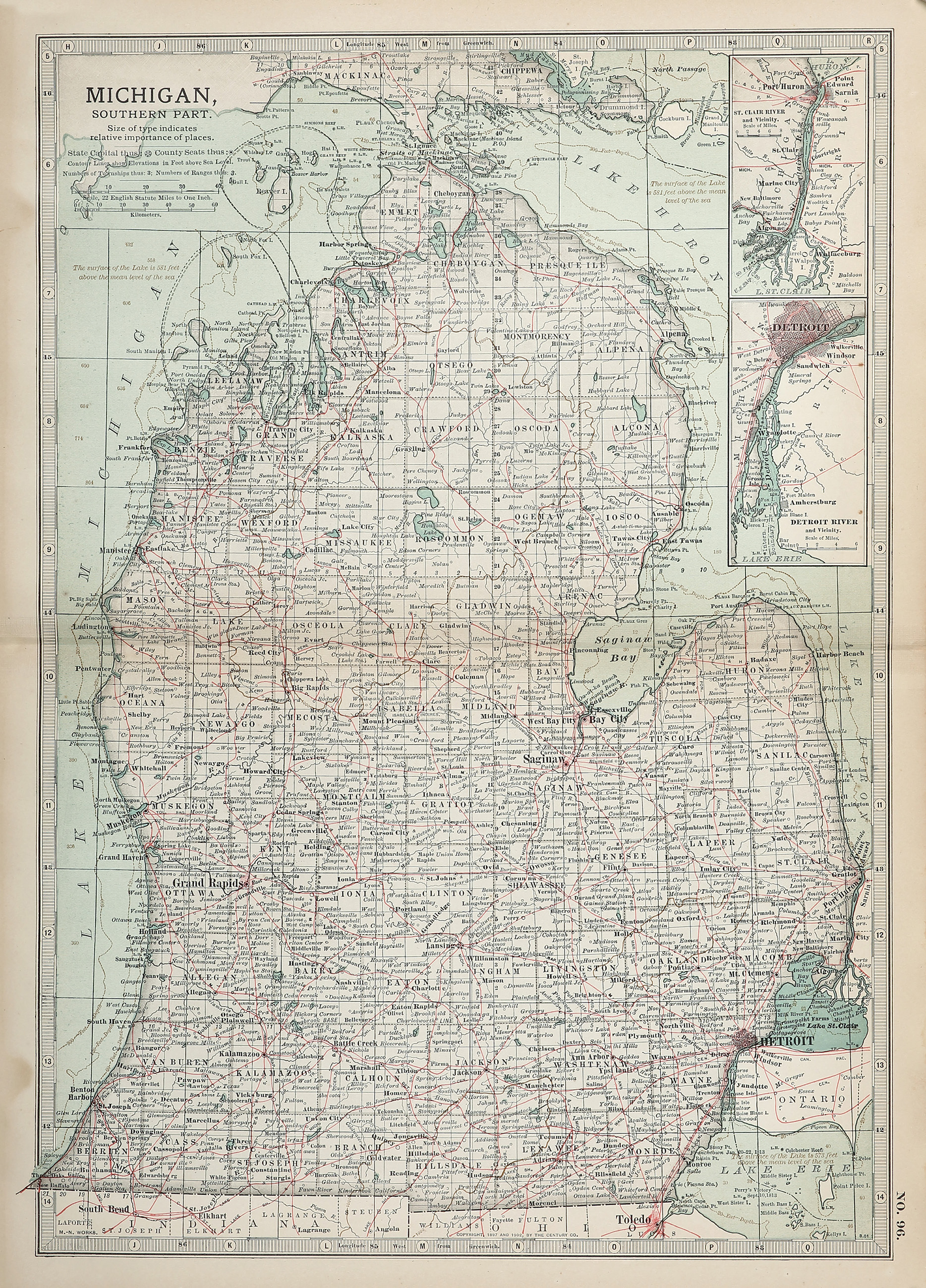 Detailed early c.20th colour engraved map of the southern part of Michigan.