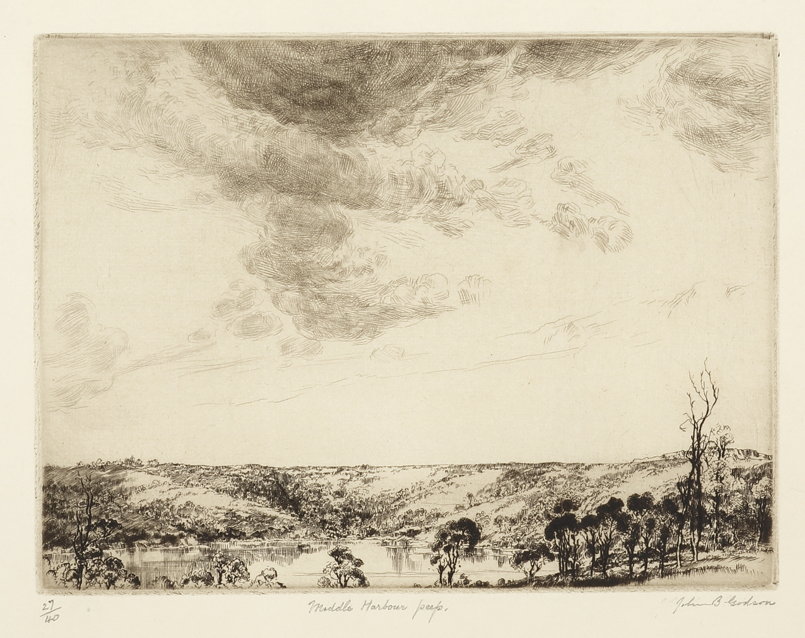 Fine etching by the master print maker John Barclay Godson of Middle Harbour. In near mint condition with wide margins.