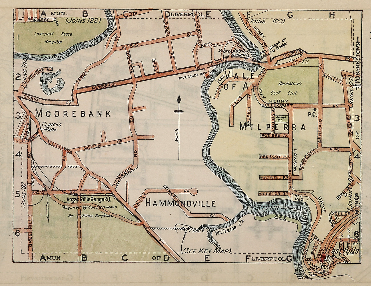 Scarce hand coloured miniature c.20th map of Milperra, Moorebank and Hammondville showing streets and major thorough fares.