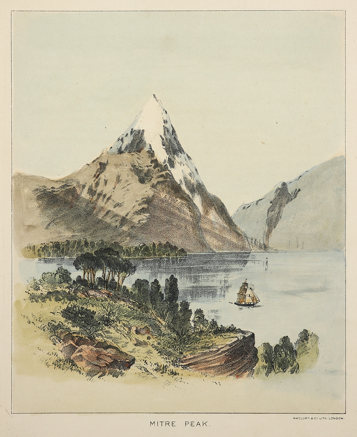Scarce c.19th lithograph of Mitre Peak, the iconic mountain in New Zealand’s South Island.