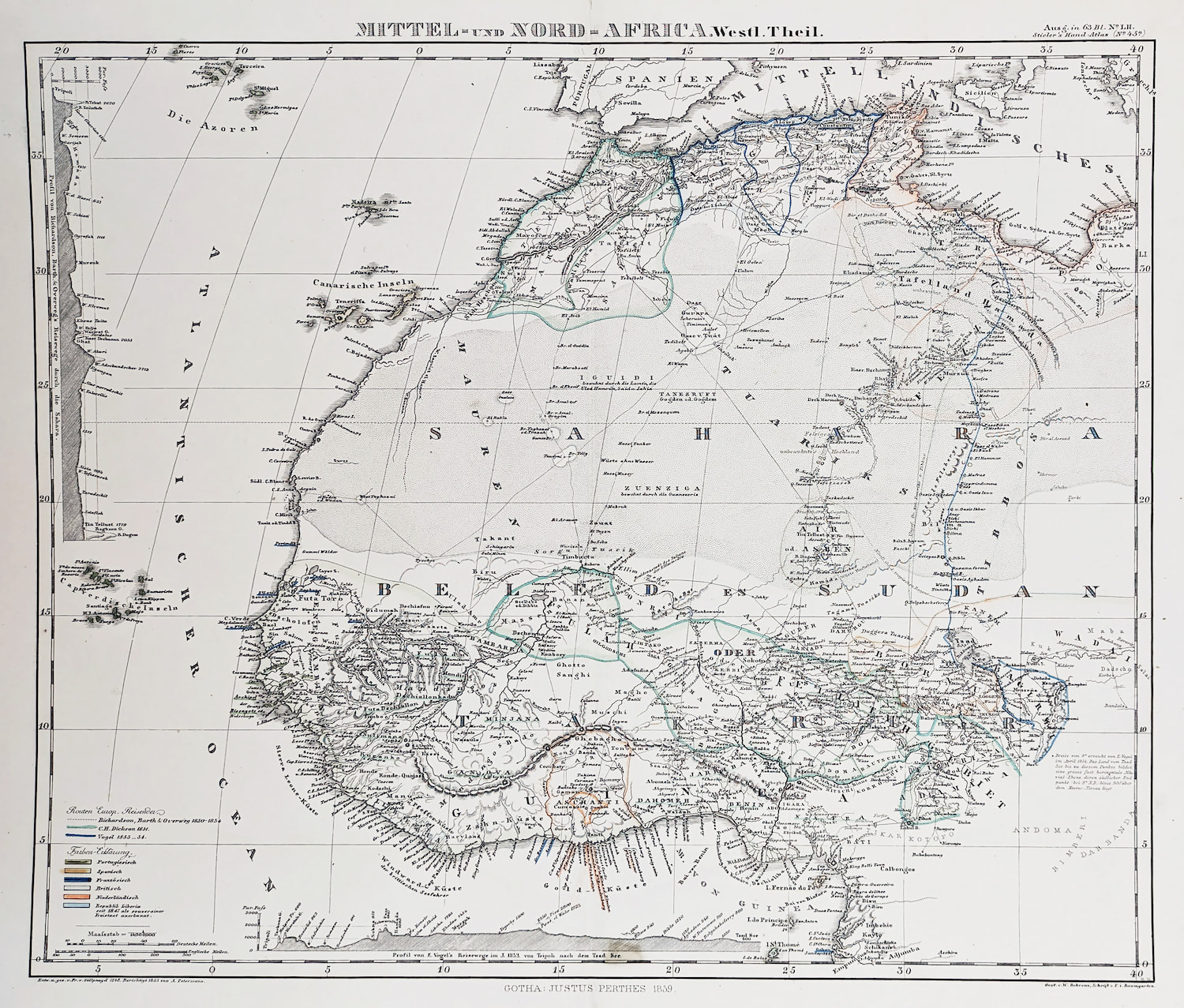 Very detailed German c.19th map of north west Africa. Although dated 1859 this map was not issued until 1862 in the 3rd edition of Stielers Handatlas. Collections: Library of Congress: LC control no. n 88080340 National Library Australia: Bib ID 1052266 … Read Full Description