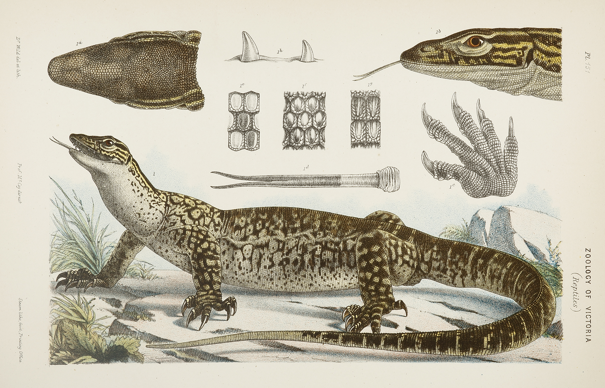 Modern Common Name: Sand GoannaModern Binomial Name: Varanus GouldiiDistribution: Australia wide Rare lithograph from Frederick McCoy’s, “Natural history of Victoria; Prodromus of the zoology of Victoria; or figures and descriptions of the living species of all classes of the Victorian indigenous … Read Full Description