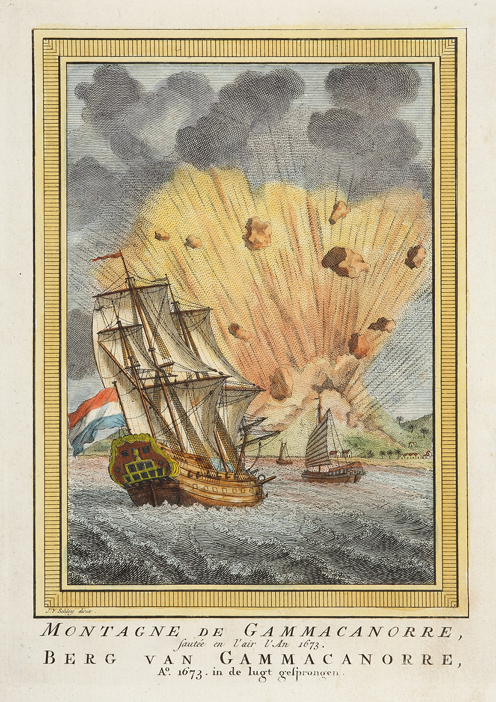 Scarce c.18th engraving showing the 1673 volcanic eruption of Gamkonora, Moluccas Islands of Indonesia.