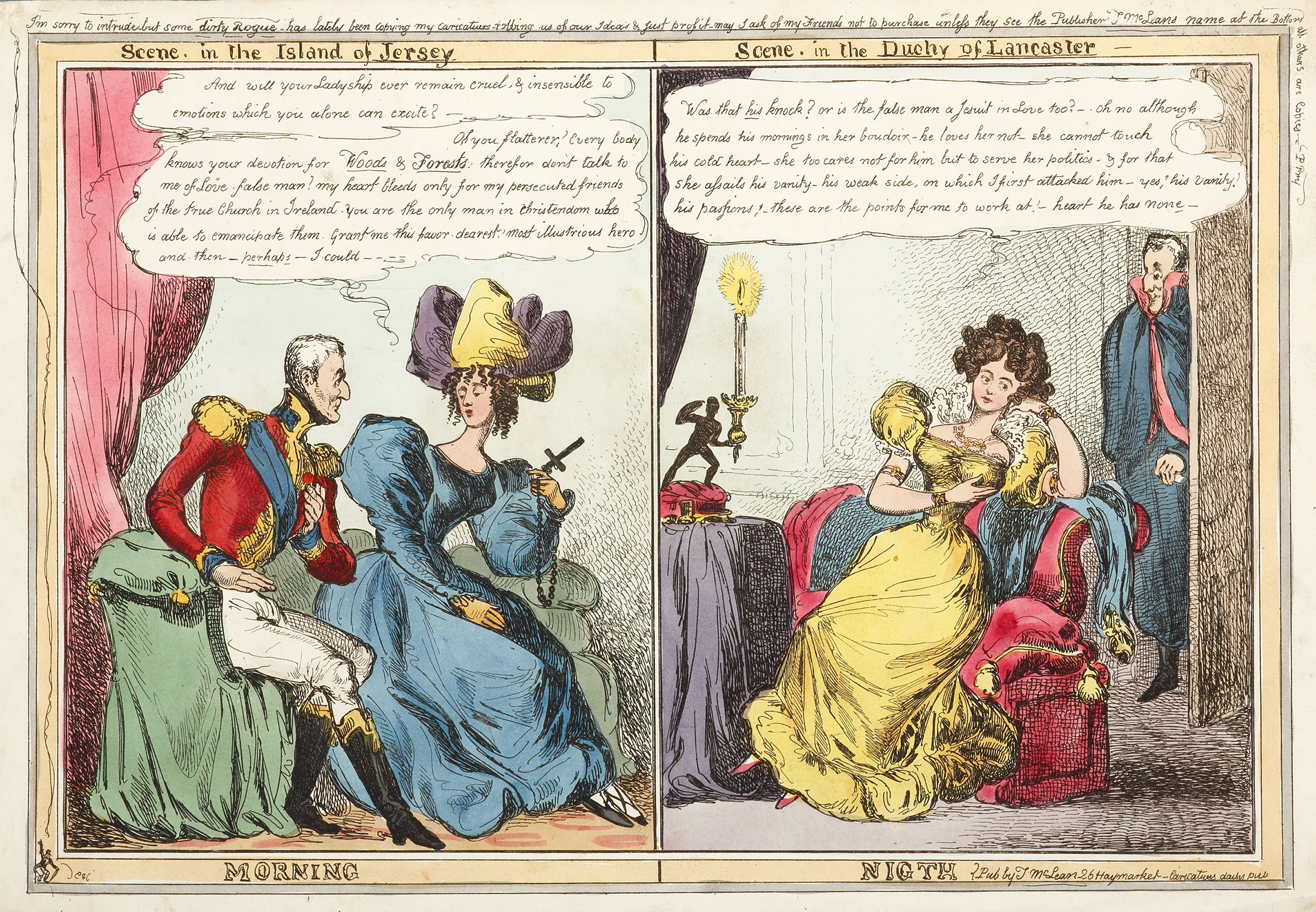 The print is both an allusion to his womanising tendencies and the unpopularity of his Roman Catholic Relief act of 1829. It almost seems to suggest that one was a consequence of the other, that his weakness for beautiful women, lead to his political reform in Ireland.