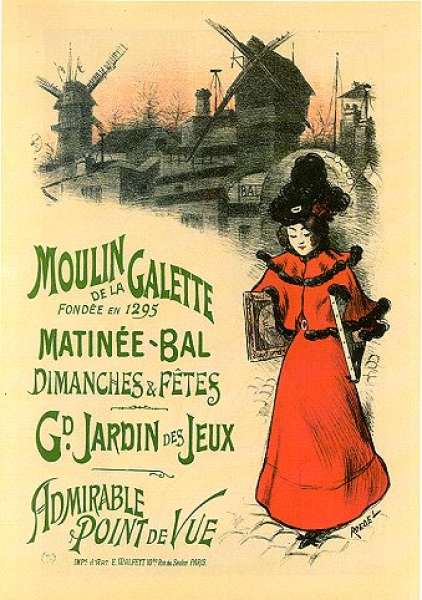 "A group of (Montmartre) artists, including Somm, Raffelli and de Feure, decided to make a sale of their work at the H�tel Drouot, the famous Paris auction house. To announce it, Roedel designed a poster showing an artist’s model walking down a steep hill to Paris, carrying two canvases under her arm…The model is charmingly dressed, in an outfit very like the skating girl of Cheret’s poster. In the background are the windmills of the Moulin de la Galette, which dominated the landscape of Montmarte until eclipsed by the dome of Sacre Coeur. The Hotel Drouot refused the poster, but it was seen by the manager of the Moulin de la Galette, who commissioned the version shown here"(Rennert, PAI-XXVII, 571)