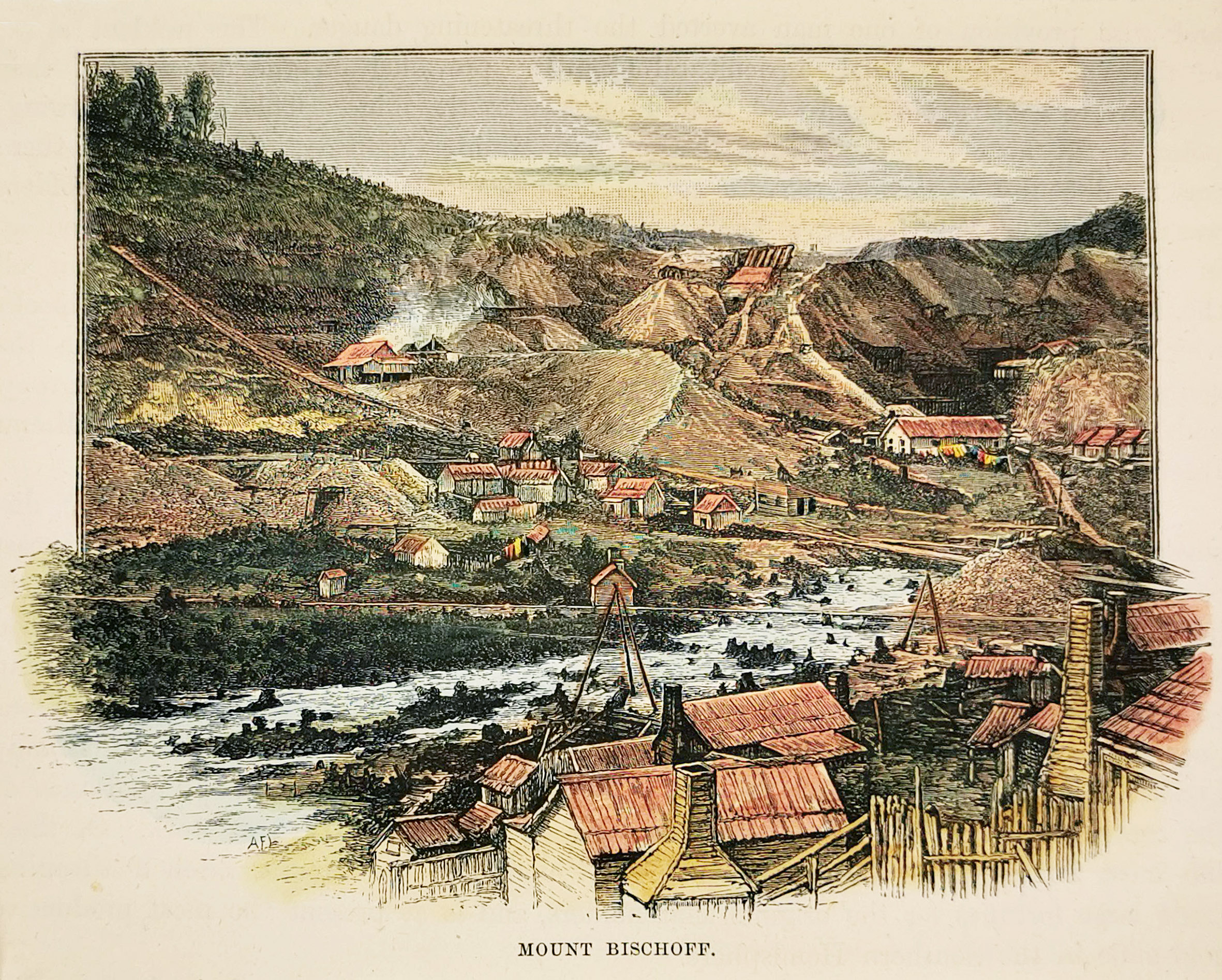 Colonial engraving of Mount Bischoff mine in the north-western region of Tasmania.